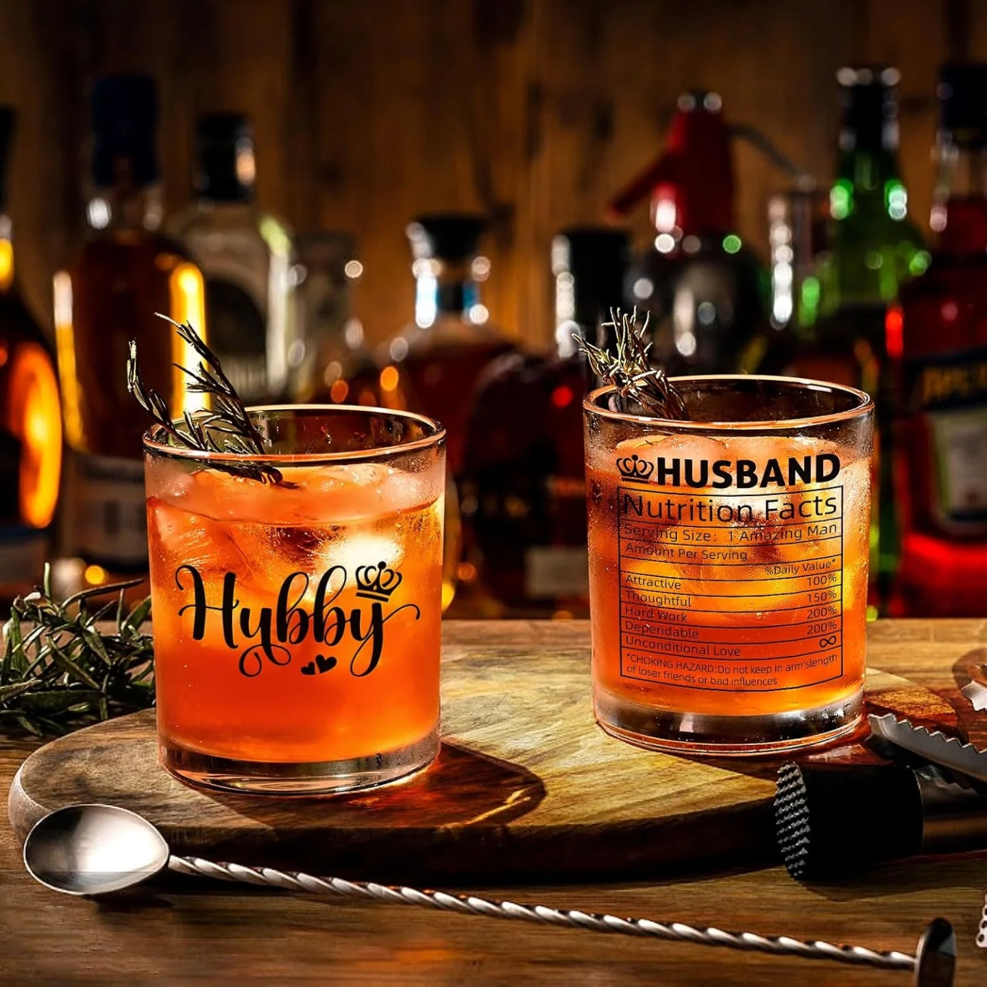 A clear 10oz whiskey glass featuring a humorous ‘Hubby’ design with a crown and ‘HUSBAND Nutrition Facts’ print. This thoughtful glass is an ideal gift for husbands, perfect for enjoying whiskey or other spirits.
