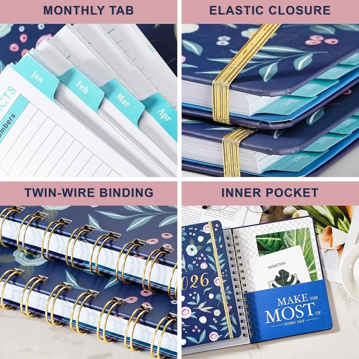 This Heartening Gifts 2026 weekly and monthly planner features a durable hardcover with a beautiful navy blue and pink floral pattern. Measuring 6.3″ x 8.4″, it includes colorful monthly tabs, premium paper, and twin-wire binding for easy use. Perfect for organizing your schedule from January to December 2026.