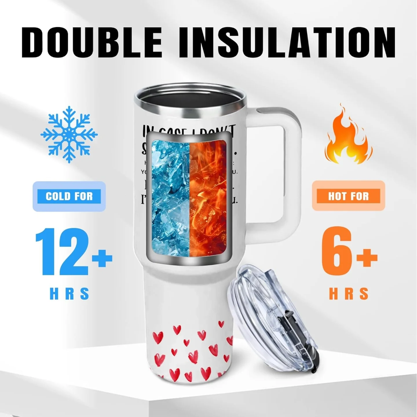 This 40oz white stainless steel travel cup features double-wall vacuum insulation, perfect for keeping beverages hot or cold. It comes with a convenient handle and a heartfelt ‘In Case I Don’t Say It Enough, I Love You’ message with red heart accents, making it an ideal Valentine’s Day gift for a partner.