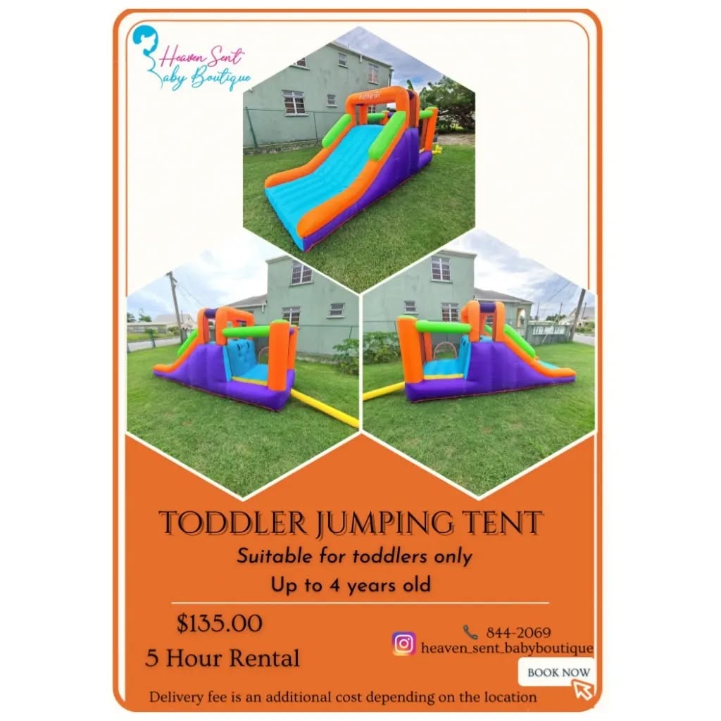This vibrant multi-color inflatable jumping tent and slide combo from Heaven Sent Baby Boutique is designed for toddlers up to 4 years old. It features a spacious bouncing area and an attached slide, providing engaging entertainment for young children. This item is available for a 5-hour rental.