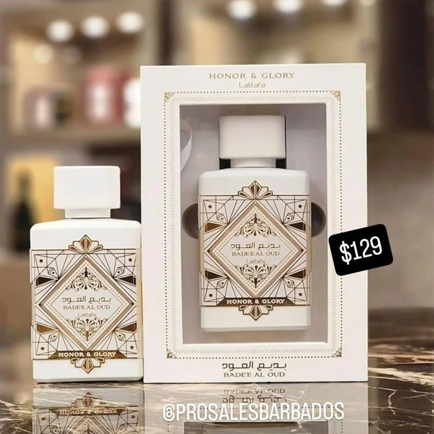 This elegant perfume, Badee Al Oud from Honor & Glory, comes in a beautifully designed bottle and packaging. A sophisticated fragrance option that exudes luxury.