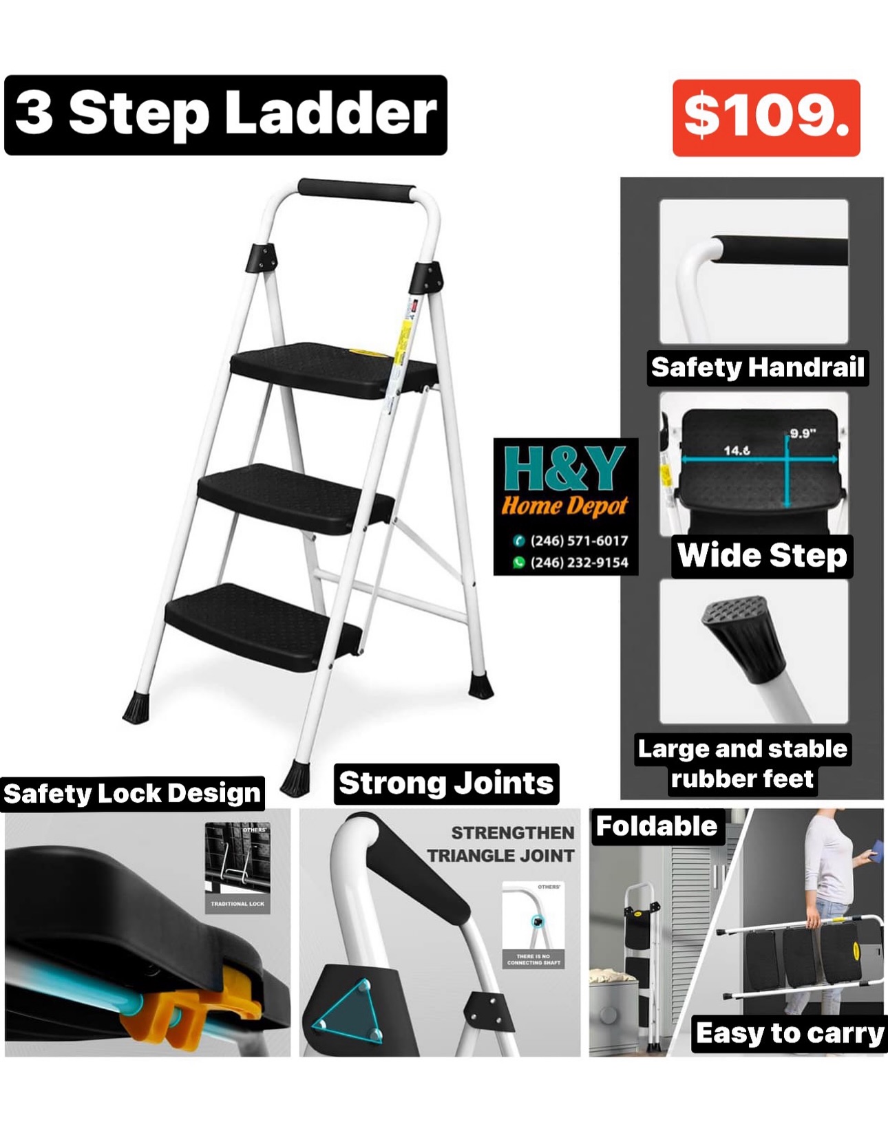 This H&Y Home Depot 3-step folding ladder features a rust-resistant steel frame with a safety locking mechanism for enhanced stability. It includes wide pedals with a non-slip rubber pattern, large stable rubber feet, and a soft sponge-covered handle for a comfortable and secure climbing experience. Designed for convenient storage and portability, it’s ideal for various indoor and outdoor tasks.