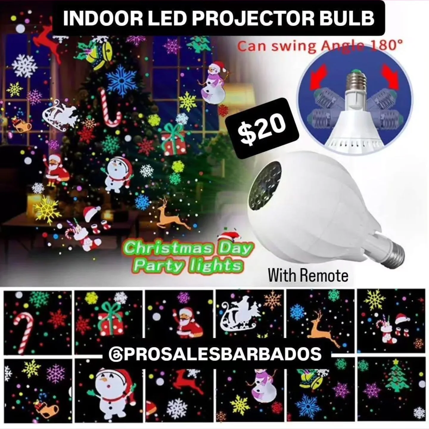 This indoor LED projector bulb casts vibrant patterns with a swing angle of 180°, perfect for Christmas parties and gatherings. It includes a remote for easy operation and features colorful holiday projections like snowmen and reindeer.