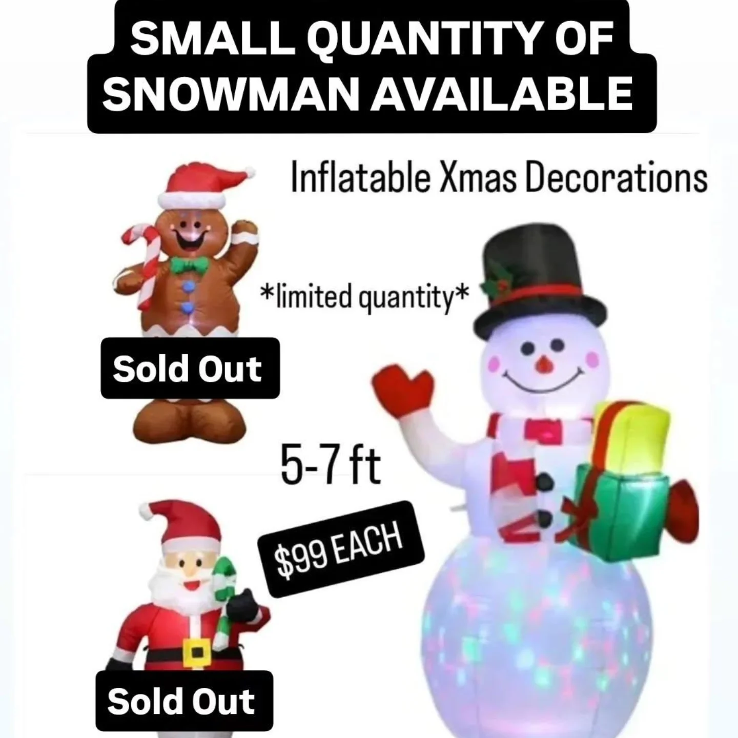 This inflatable snowman is perfect for adding a festive touch to your holiday decor. Standing between 5 to 7 feet tall, it features a classic snowman design with a hat and scarf. Limited quantities are available, so act fast!