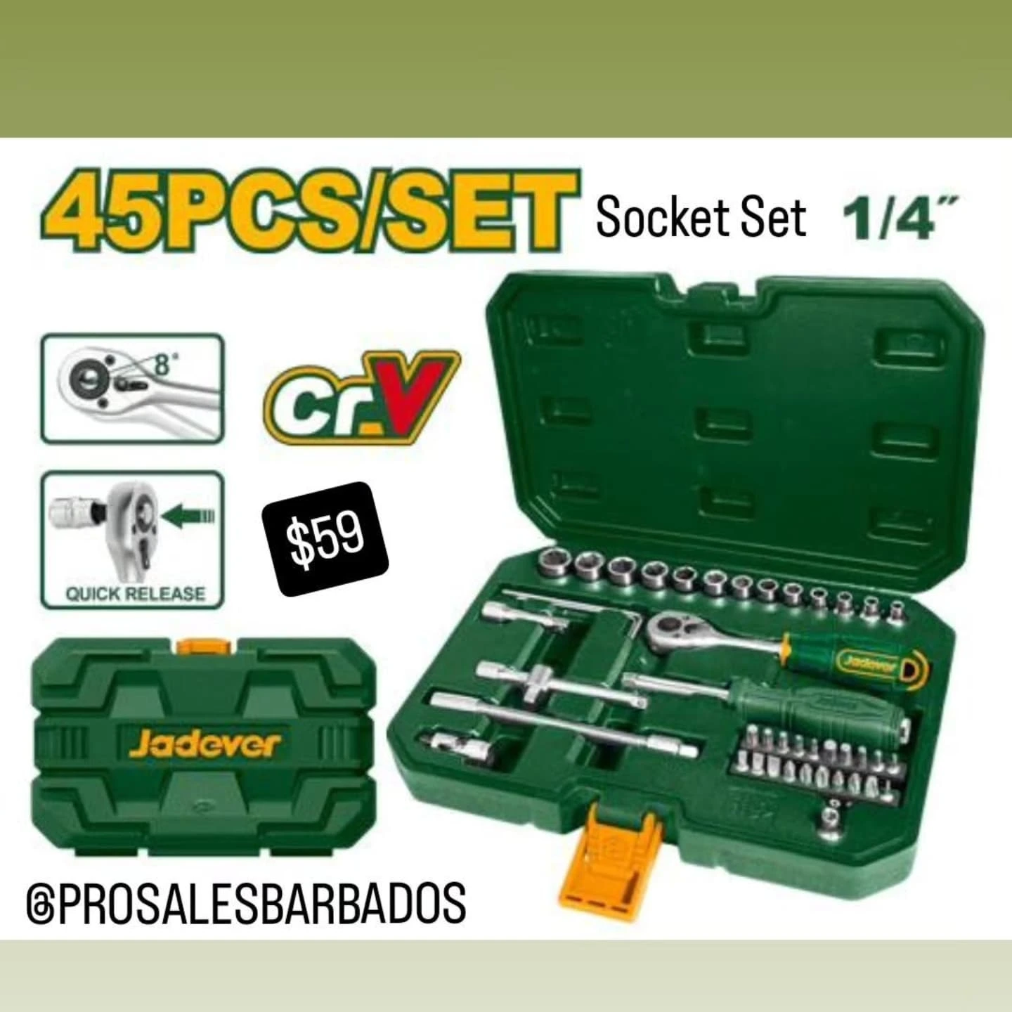 A 45-piece Jadever socket set, featuring 1/4″ drive tools made from CrV (Chrome Vanadium) steel, including a quick-release ratchet, sockets, and extensions, all housed in a durable green case. Available from Pro Sales Pinfold Street Bridgetown.