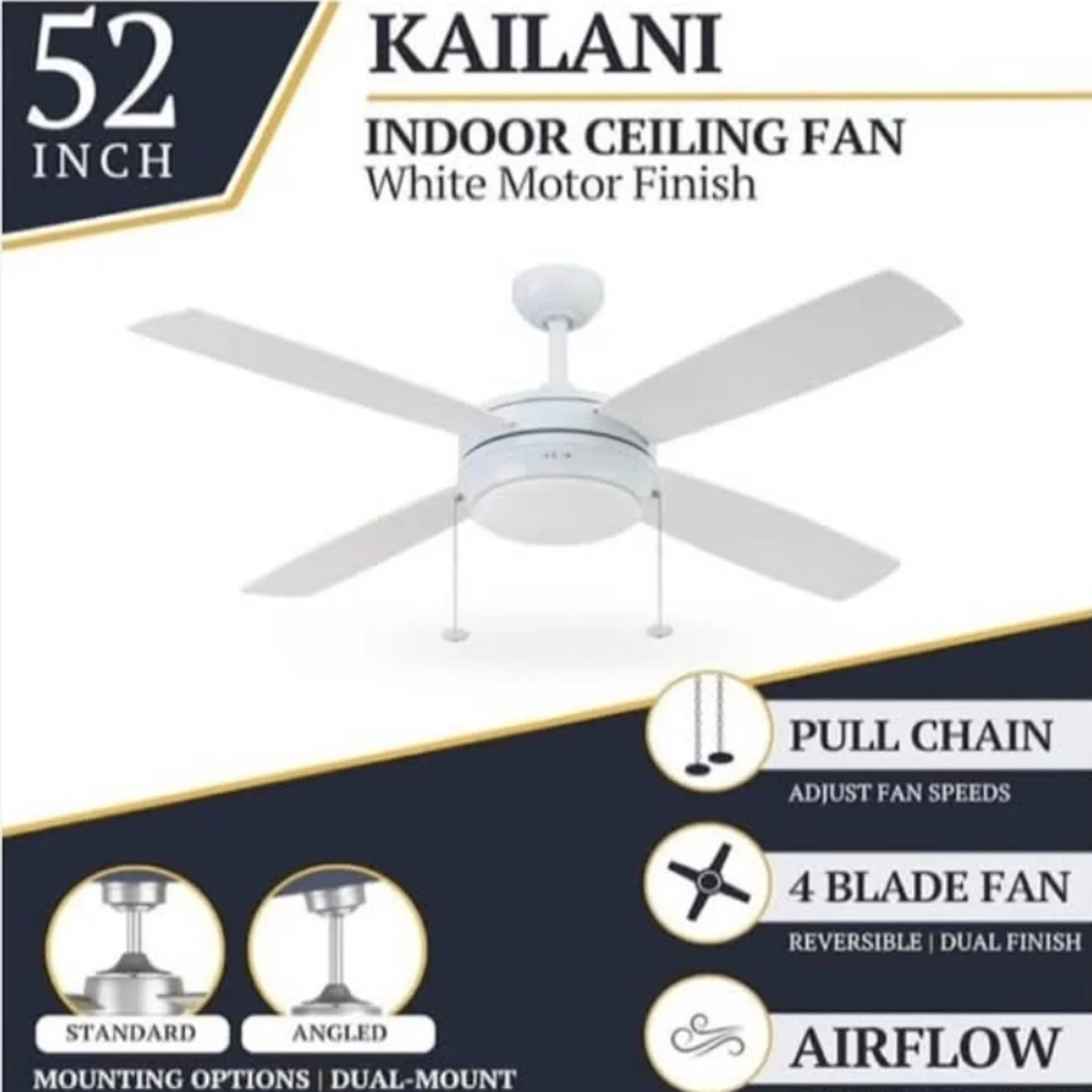 The KAILANI 52-inch indoor ceiling fan features a clean white motor finish and four reversible blades. It includes a convenient pull chain for speed adjustments and offers dual-mount options for standard or angled installation.