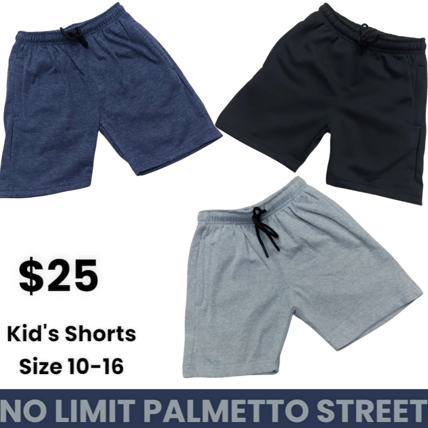 Comfortable kid’s drawstring shorts available in blue, black, and grey. These soft knit shorts feature an elastic waistband with an adjustable drawstring, perfect for casual wear. Available in sizes 10-16.