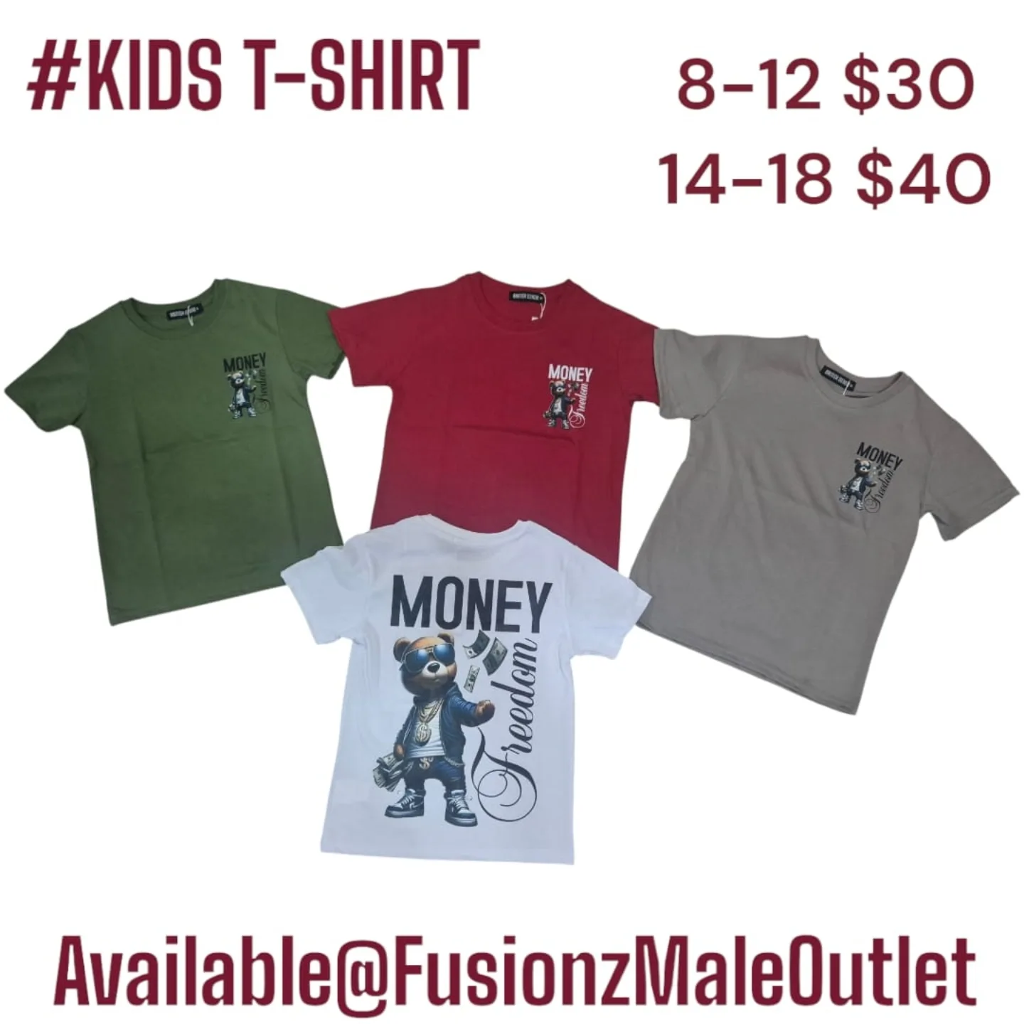 This is a kids’ graphic t-shirt featuring a bear design with the words ‘MONEY’ and ‘freedom’. Available in sizes 8-12 and 14-18. This t-shirt is suitable for children.