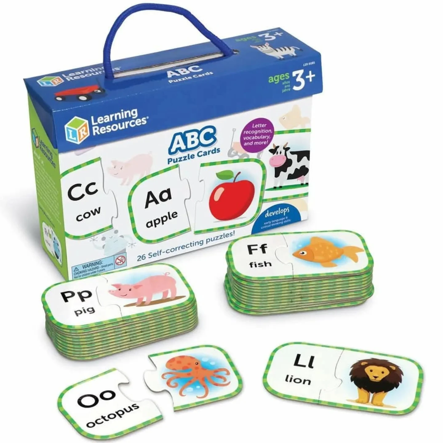 This Learning Resources ABC Puzzle Cards set is an educational learning kit designed for children aged 3 and up. It features 26 self-correcting two-piece puzzles, each matching a letter with a corresponding image and word to help master early alphabet and language skills. The set comes in a sturdy, reusable storage box.