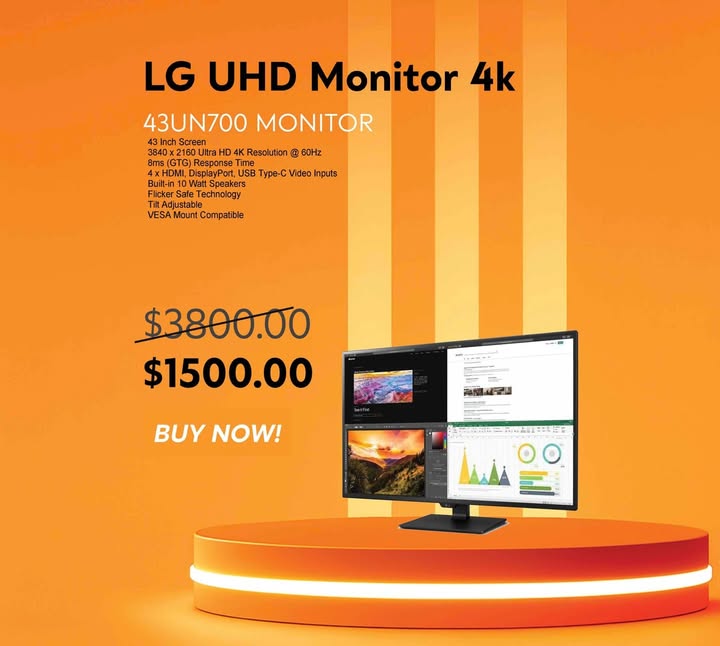 The LG 43UN700 Monitor features a 43-inch screen with a 3840 x 2160 Ultra HD 4K resolution at 60Hz. It offers 8ms GTG response time and includes 4 x HDMI, DisplayPort, and USB Type-C video inputs. Built-in 10-watt speakers and VESA mount compatibility enhance its versatility.