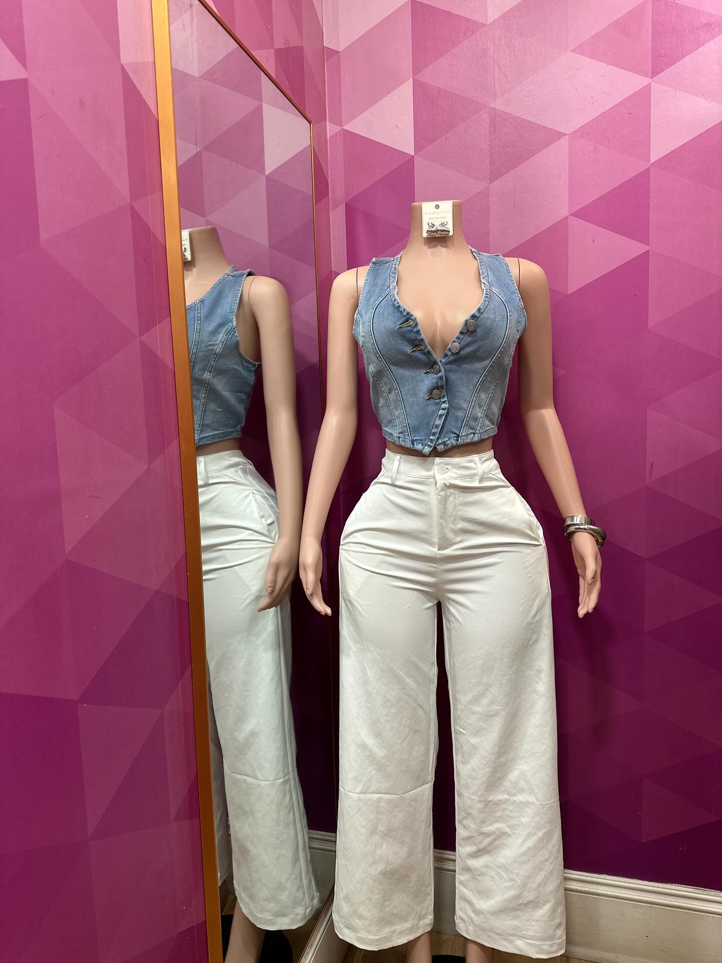 This versatile women’s ensemble features a light blue denim crop top with a V-neckline and button-front closure, paired with high-waisted wide-leg pants. Both the denim top and wide-leg pants are available in small, medium, and large sizes. The wide-leg pants also come in white, khaki, and black color options.