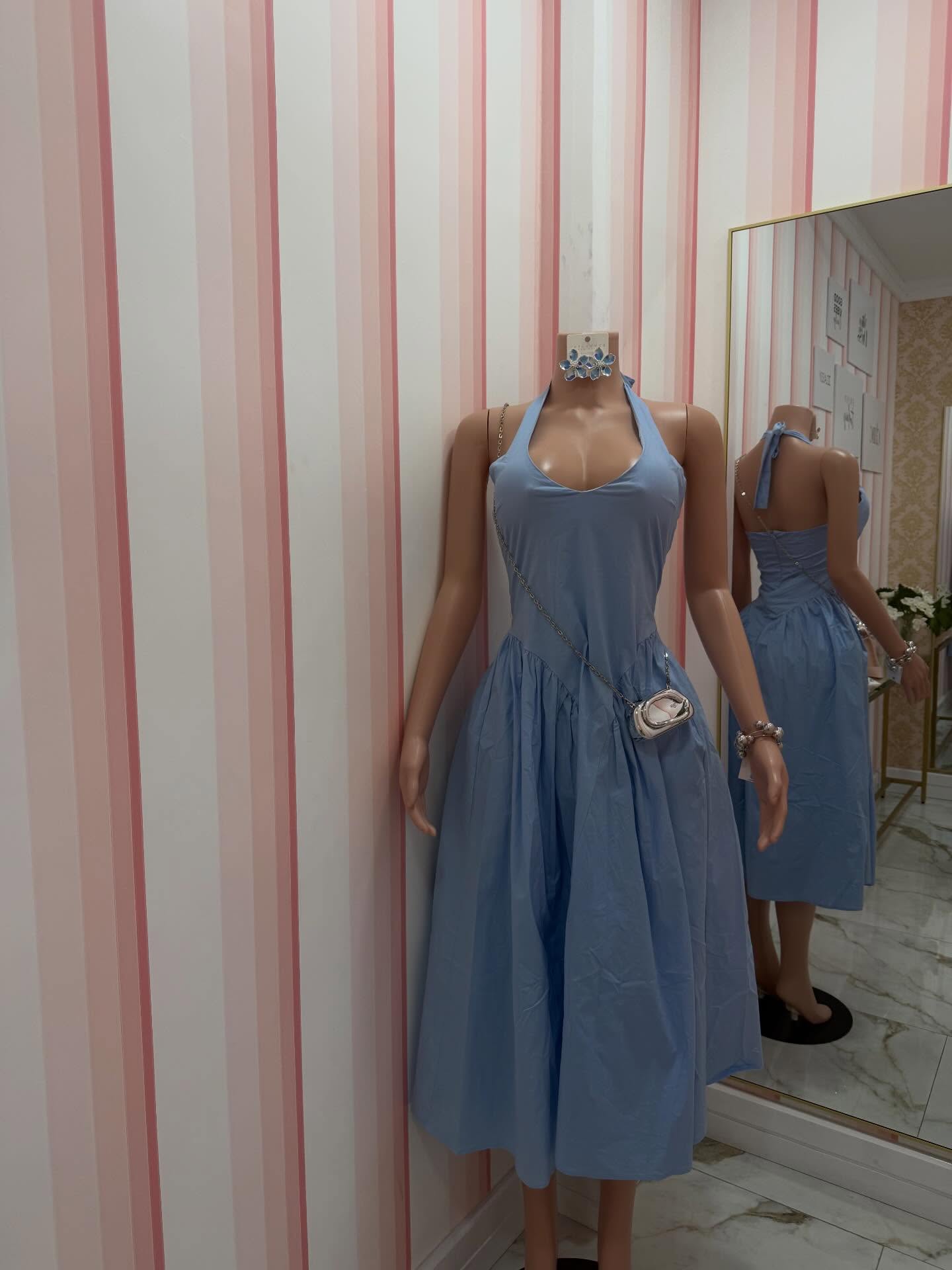 A light blue halter neck midi dress with a flowing skirt. This dress is available in small, medium, and large sizes, and also comes in yellow, khaki, and white.