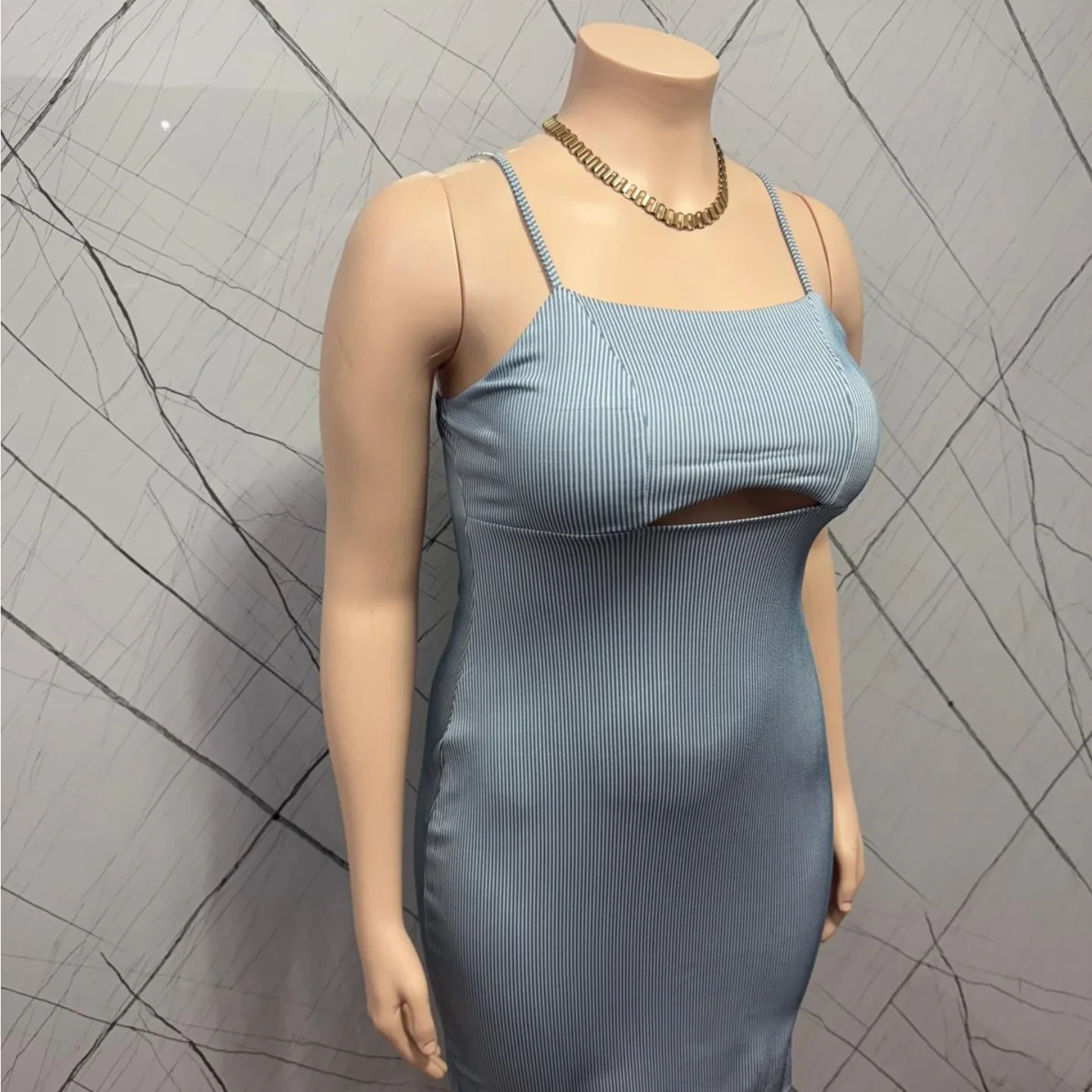 This is a light blue bodycon dress with a pinstripe pattern. It features thin spaghetti straps and a cutout detail at the bust. The dress is form-fitting and appears to be made of a stretchy material. Available in store.