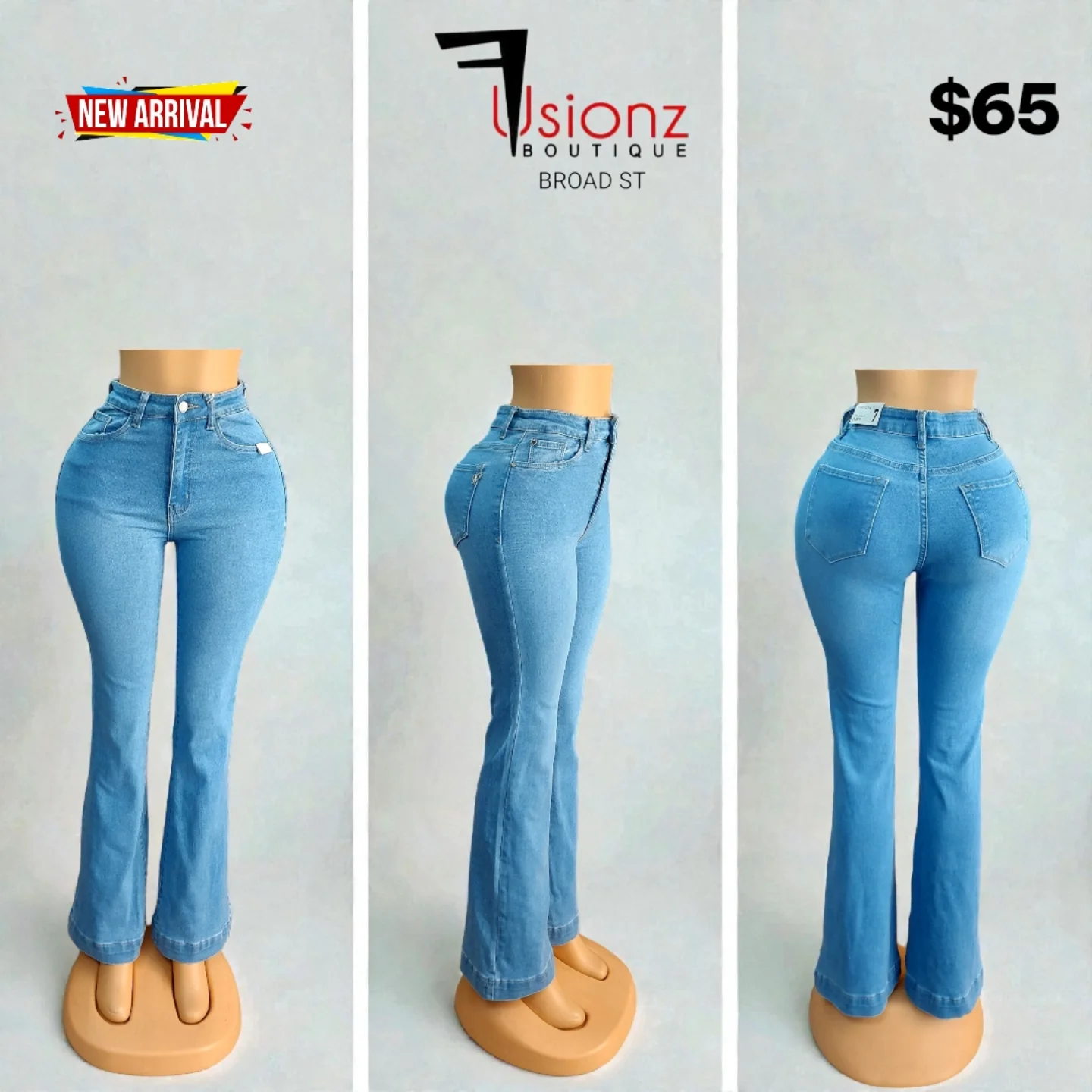 These light blue women’s jeans from Fusionz Boutique feature a high-waisted design and a stylish flare leg, offering a classic denim look. Perfect for a casual yet chic outfit.