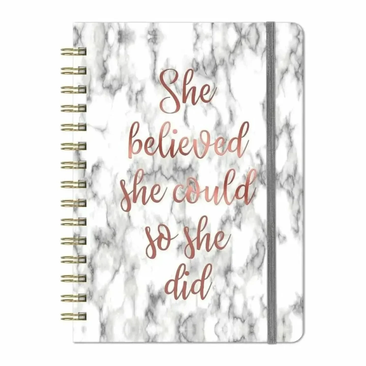 This inspirational journal features a marble grey and rose gold design with the quote “She Believed She Could So She Did.” It is college ruled, spiral-bound, and includes a waterproof hardcover with an inner pocket. The journal measures 8.5″ X 6.4″ and is suitable for school, office, or home use. Premium thick paper is used.