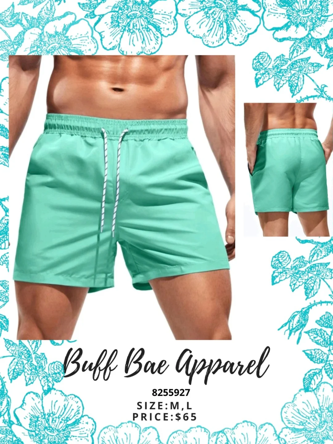 These men’s swim trunks are a vibrant mint green color, perfect for the beach or pool. They feature an elastic waistband with a drawstring for a comfortable and adjustable fit. Available in sizes M and L.