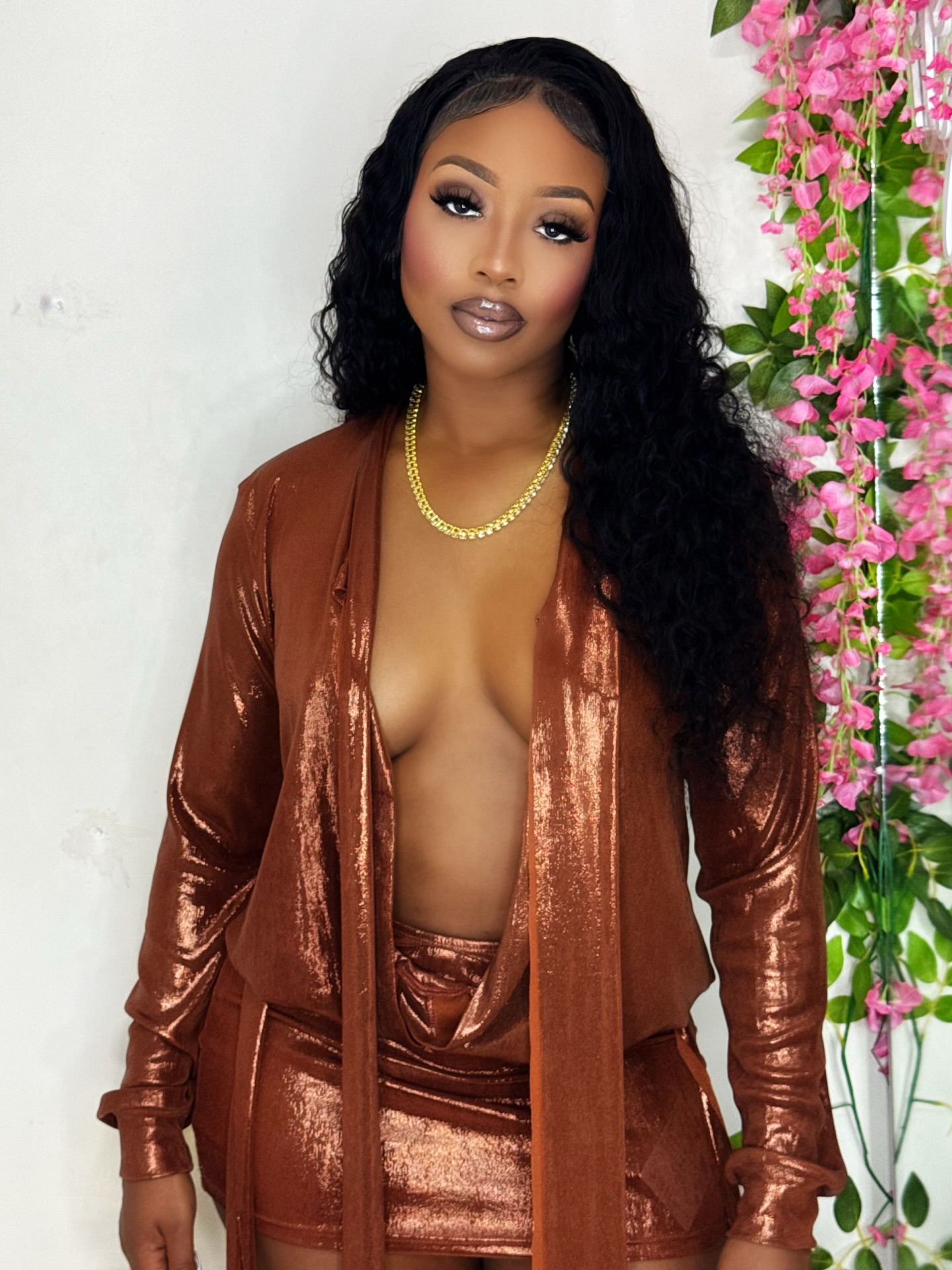 This metallic bronze two-piece set includes a long-sleeve top with an open front design and a matching mini skirt. The outfit features a shimmering texture, perfect for making a statement. Available in Small, Medium, and Large sizes.