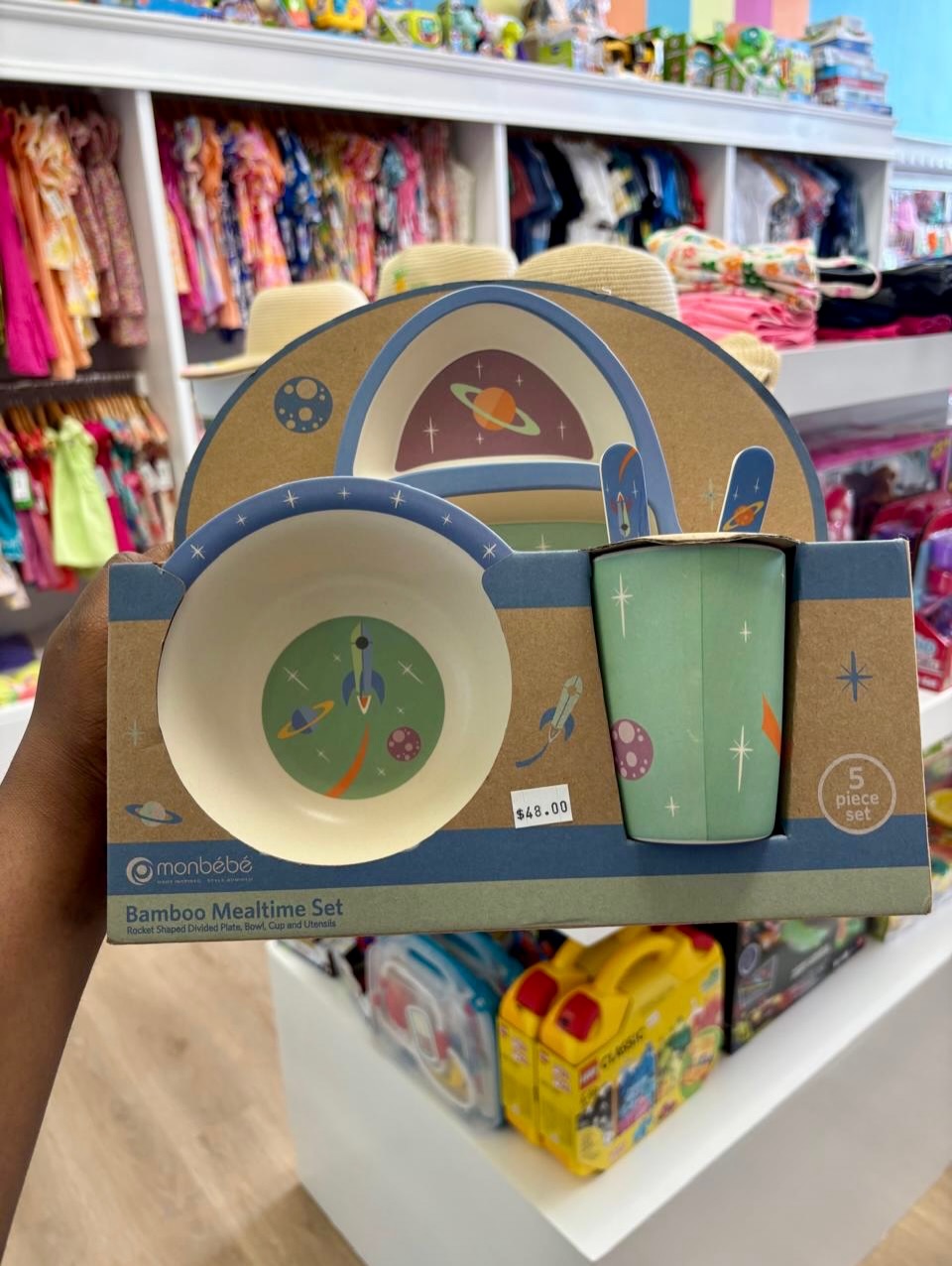 This monbébé 5-piece bamboo mealtime set features a fun rocket and space theme, perfect for toddlers and young children. The set includes a divided plate, bowl, cup, and utensils, all designed to be lightweight, durable, and kid-friendly for independent eating. Made from eco-friendly bamboo, it’s an ideal choice for everyday use or as a thoughtful gift.