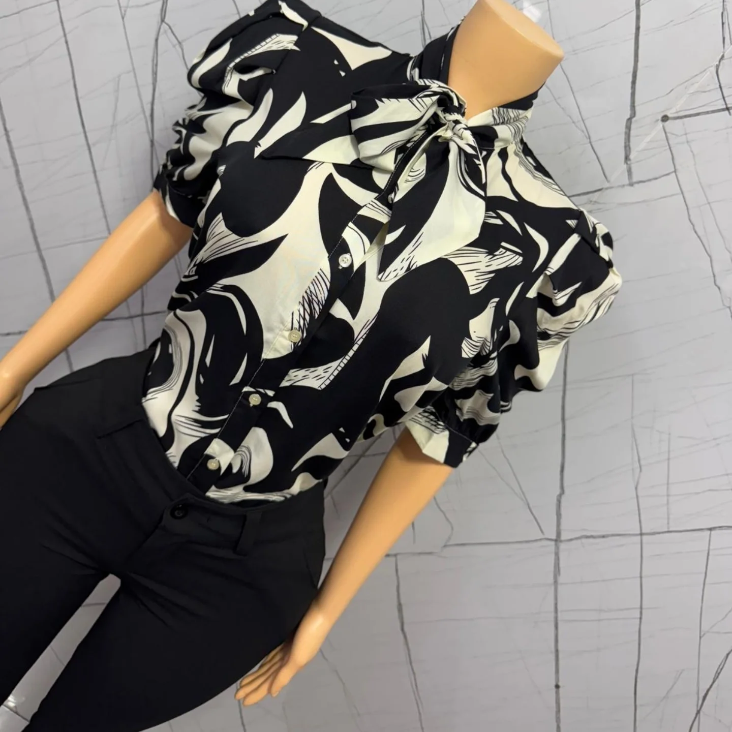 An elegant monochrome women’s work blouse featuring a black and white abstract print. This stylish top includes a pussy-bow tie-neck collar, short puff sleeves, and a button-front design, suitable for professional or smart casual occasions.