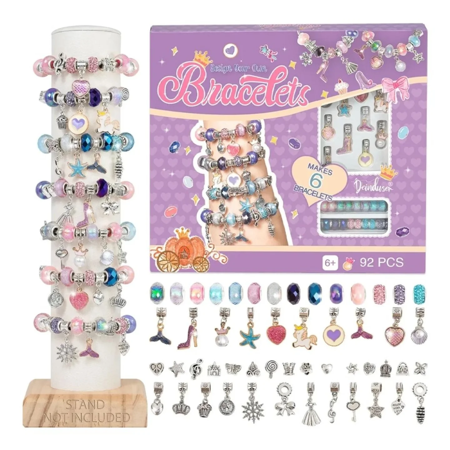 This Deinduser charm bracelet making kit for girls offers a creative outlet for designing personalized jewelry. The 92-piece set includes a vibrant assortment of beads and charms, featuring popular designs like hearts, stars, unicorns, and mermaids, enabling children aged 6 and up to craft up to six unique bracelets.