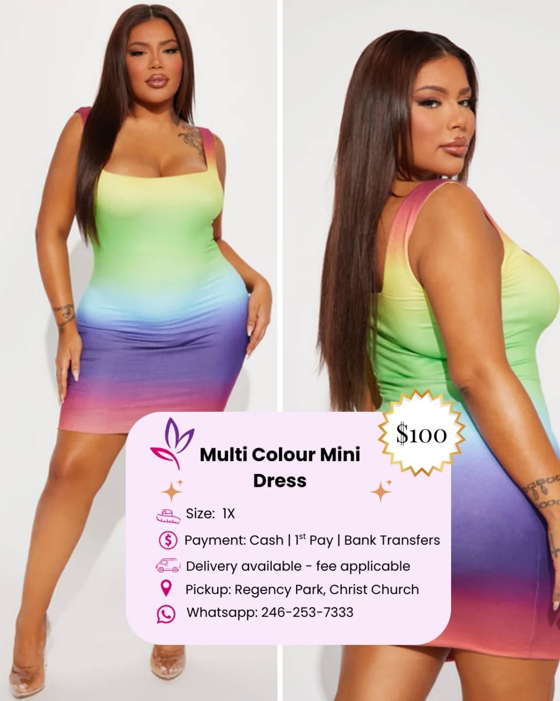 This bold and bright multi-coloured mini dress is designed to turn heads. Featuring a sleeveless and fitted design, it’s perfect for making a statement. Available in size 1X.