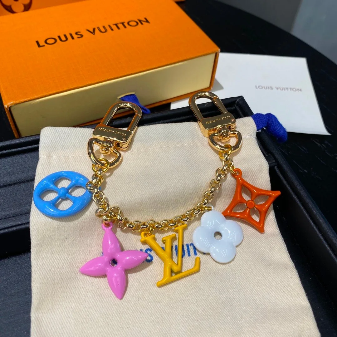 Elevate your handbag with this vibrant Louis Vuitton bag charm. It features a gold-tone chain adorned with iconic LV monogram charms in various bright colors, including blue, orange, pink, yellow, and white. A perfect luxury accessory to add a festive touch to any purse or keys.