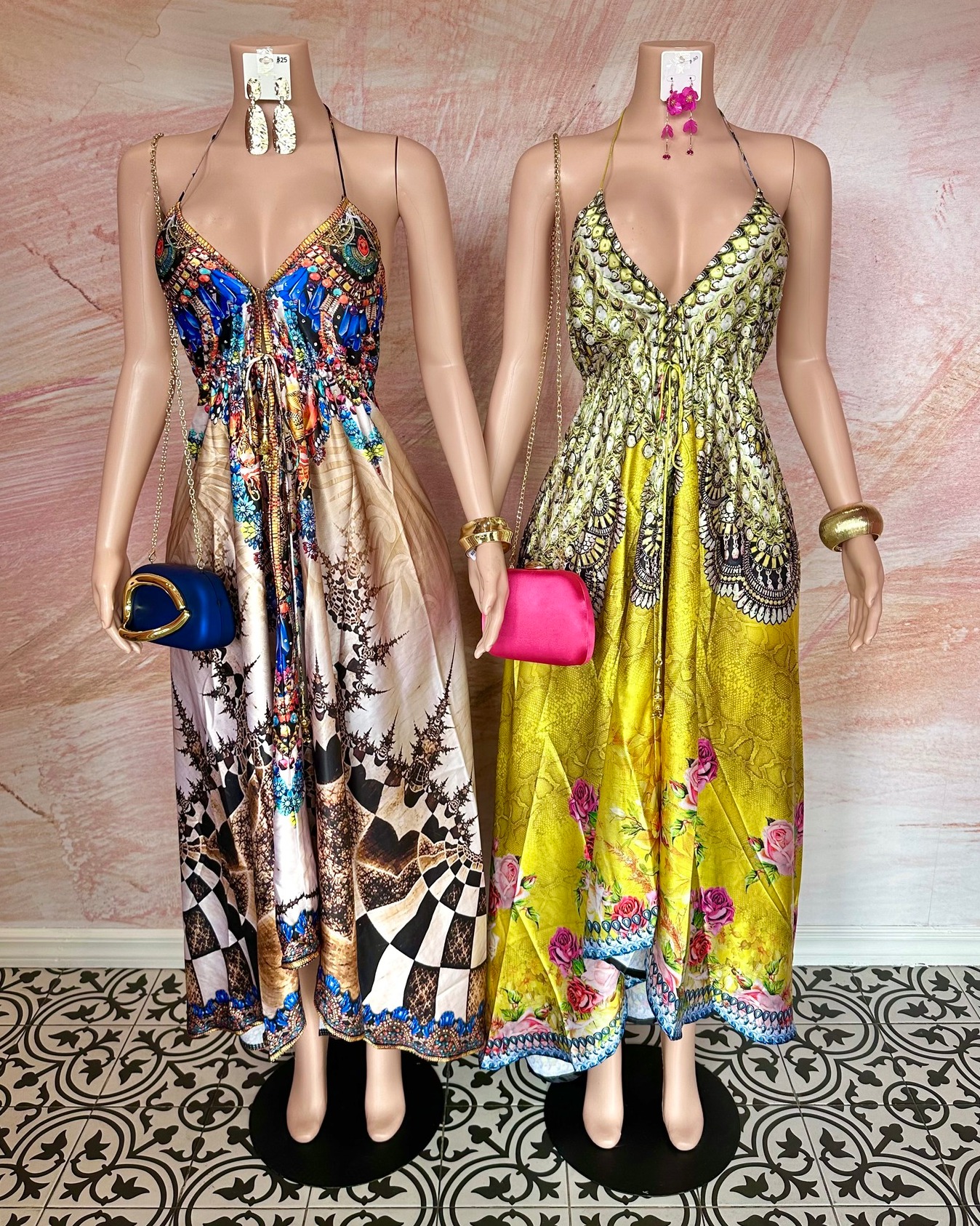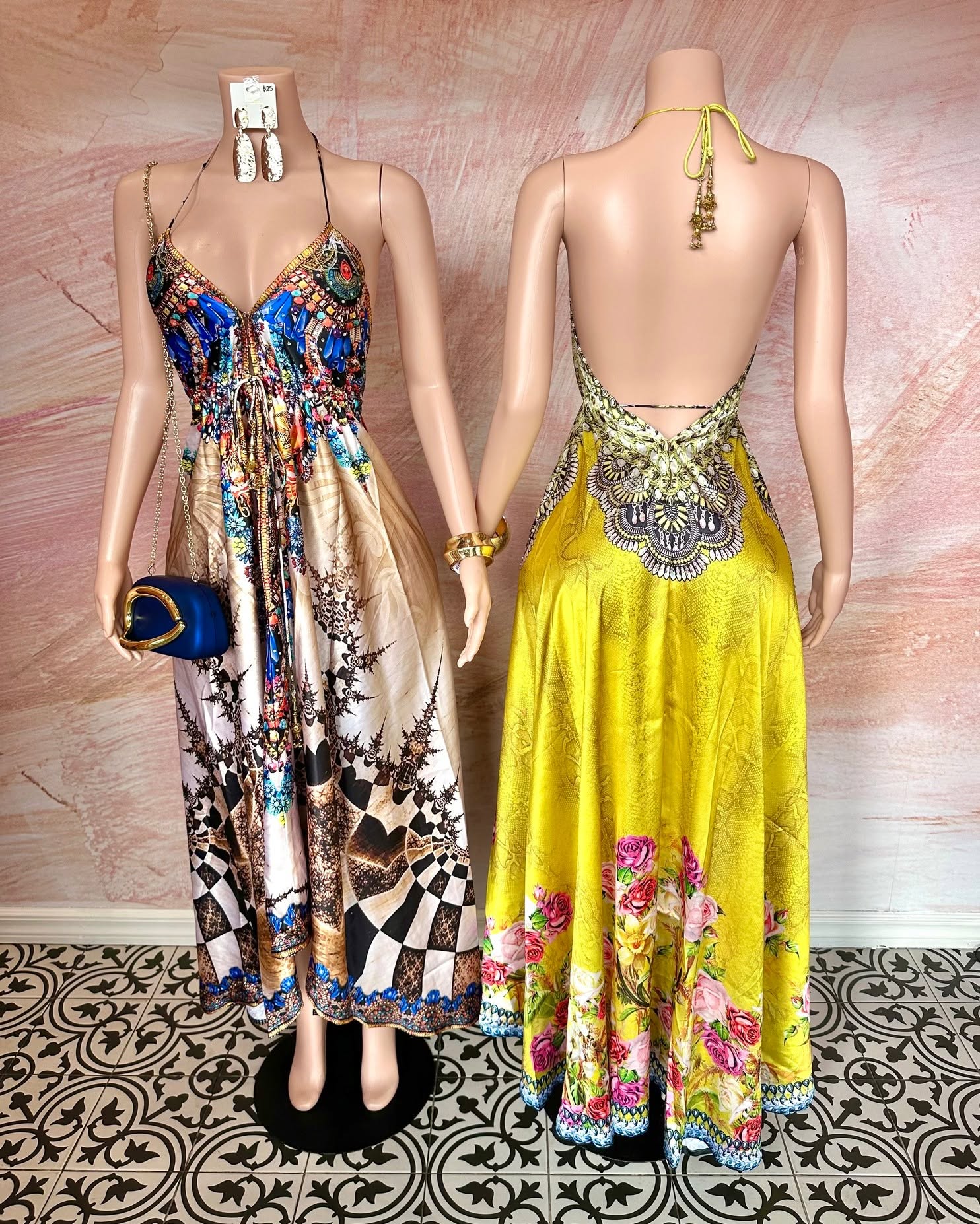 These vibrant maxi dresses feature intricate geometric and floral patterns, perfect for making a statement. Designed for women, they are sleeveless and come in a free size. Ideal for casual outings and stylish events.