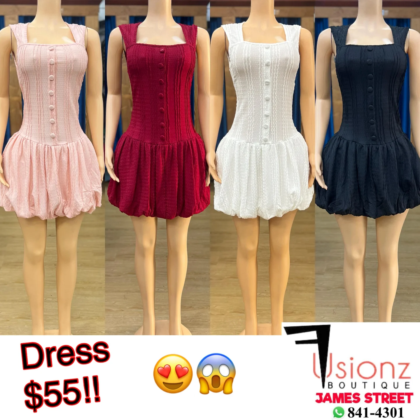 This women’s sleeveless dress features a textured fabric with button details. Available in multiple colors: pink, red, white, and black. Perfect for casual outings, it offers a comfortable fit with a flared skirt.