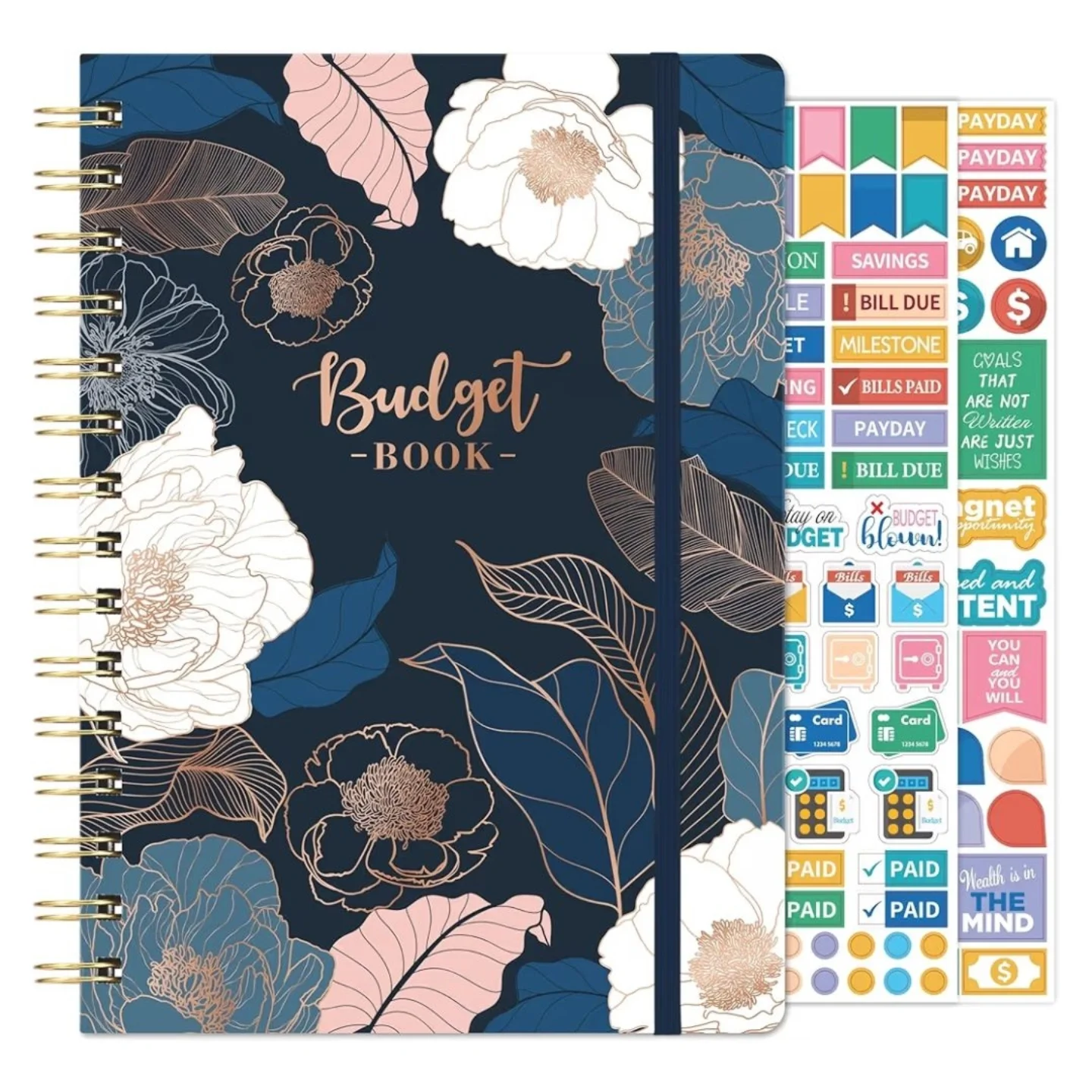 This elegant spiral-bound budget planner features a navy blue hard cover adorned with a beautiful floral print in white, light blue, and rose gold accents. Designed as an undated finance planner, it serves as an expense tracker and bill organizer, measuring 6.3″ x 8.4″. It includes sticker sheets to help manage and control personal finances effectively.