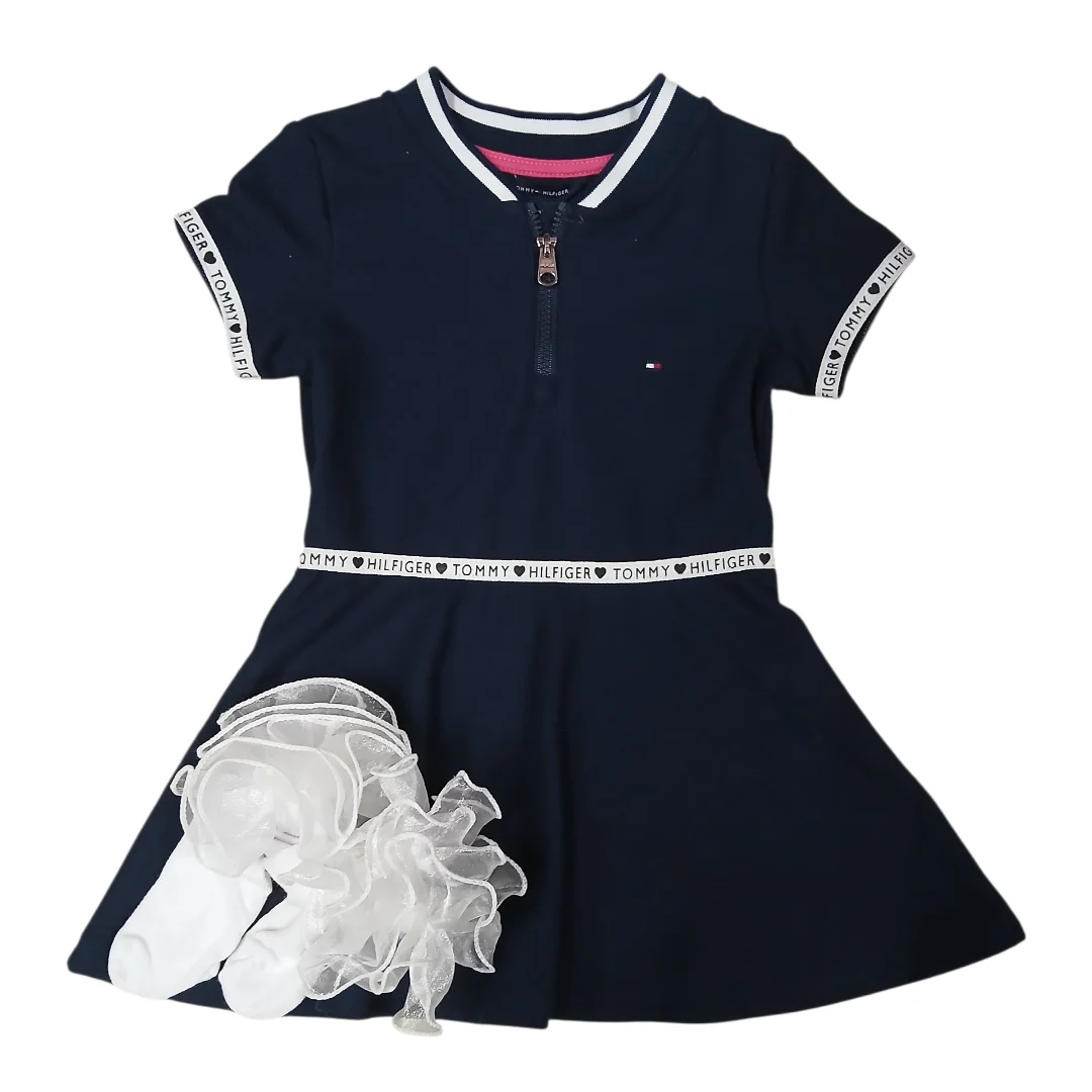 This navy blue Tommy Hilfiger dress features short sleeves, a white collared neckline with a front zipper, and distinctive Tommy Hilfiger branding on the sleeves and waist. It is available in size 2T.