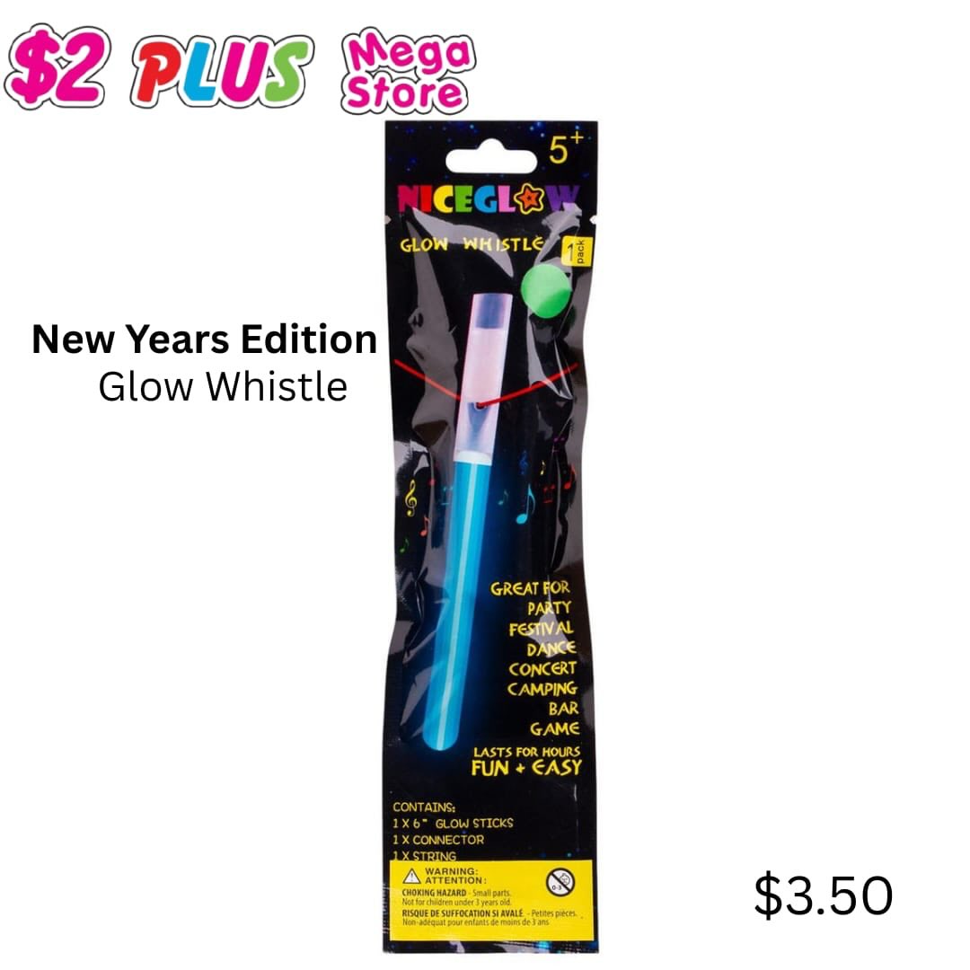 This is a New Years Edition Glow Whistle. It is great for parties, festivals, concerts, and more. The package contains 1x 6″ glow stick, 1x connector, and 1x string. It lasts for hours and is fun and easy to use.