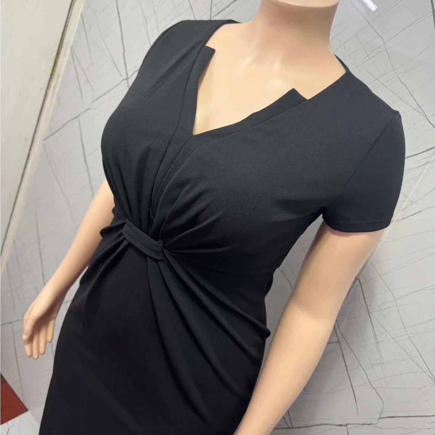 This elegant black women’s work dress features a sophisticated V-neckline with a unique notched detail and comfortable short sleeves. Designed with a flattering knotted and ruched waist, it offers a polished silhouette. Available in plus sizes, this dress is suitable for professional settings.