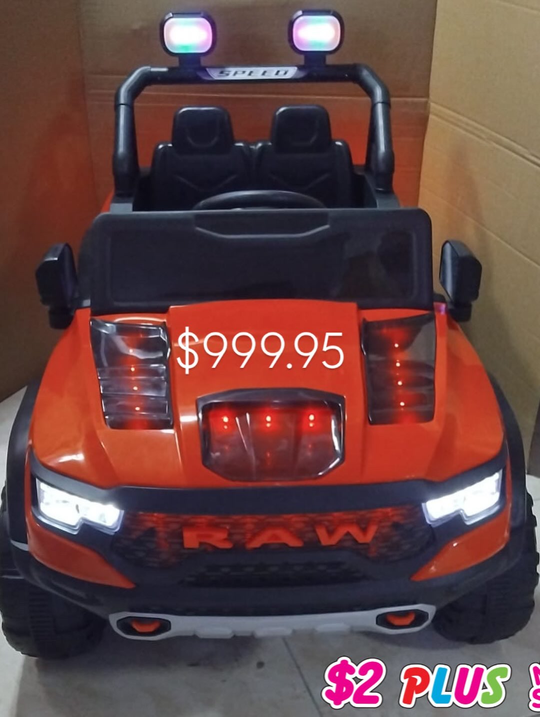 This orange electric ride-on toy car for kids features a rugged design with working headlights, taillights, and top-mounted lights. It has a two-seat interior and a prominent ‘RAW’ emblem on the front grille, suggesting a powerful off-road style.