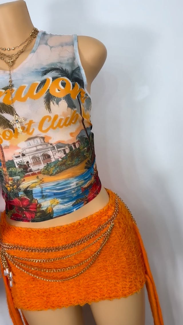 This is a two-piece set featuring a mesh tank top with a tropical resort print and an orange textured mini skirt. The skirt is adorned with a multi-layered gold chain belt. Available in sizes Small and Medium.