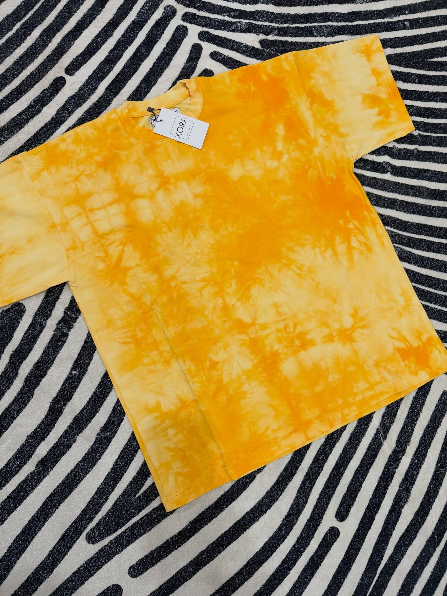 This vibrant orange tie-dye t-shirt features a casual fit and short sleeves. Perfect for a relaxed look, it is suitable for any season. The t-shirt is made from soft, comfortable material branded as XORA.