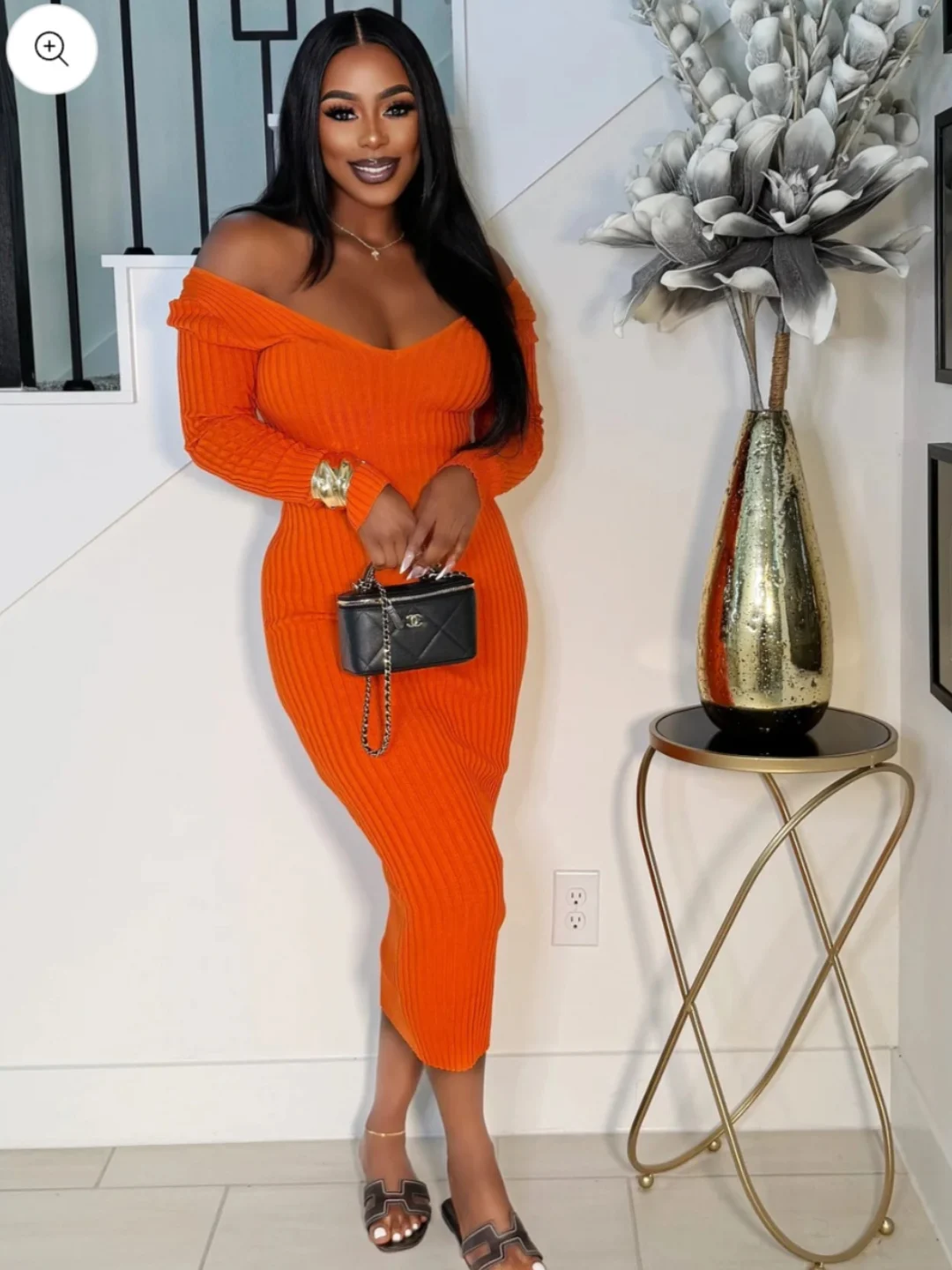 This vibrant orange dress features a ribbed texture and an off-shoulder design, perfect for a stylish and elegant look. Available in Small, Medium, and Large sizes.