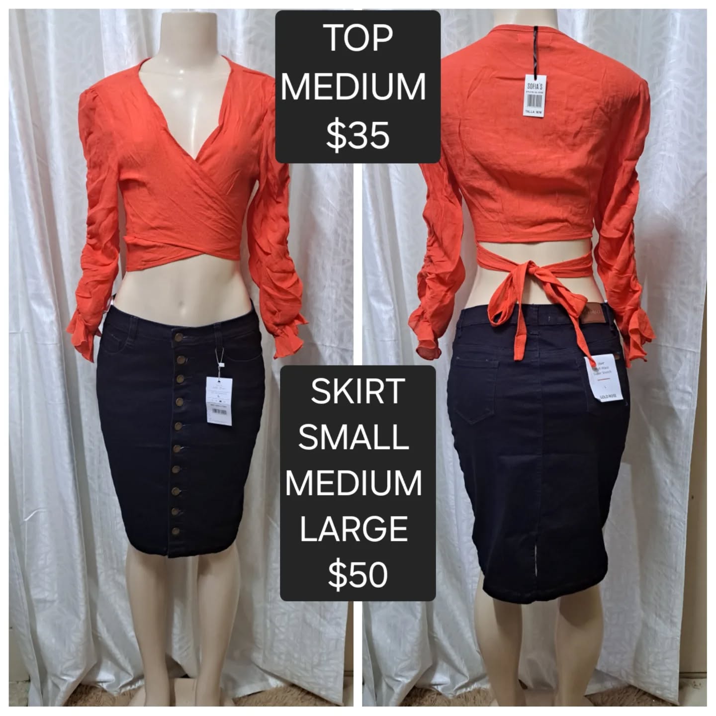 This set includes an orange wrap-around crop top with long sleeves and a black button-up skirt. The top is available in size M, while the skirt is offered in sizes S, M, and L. Perfect for a chic and stylish look.