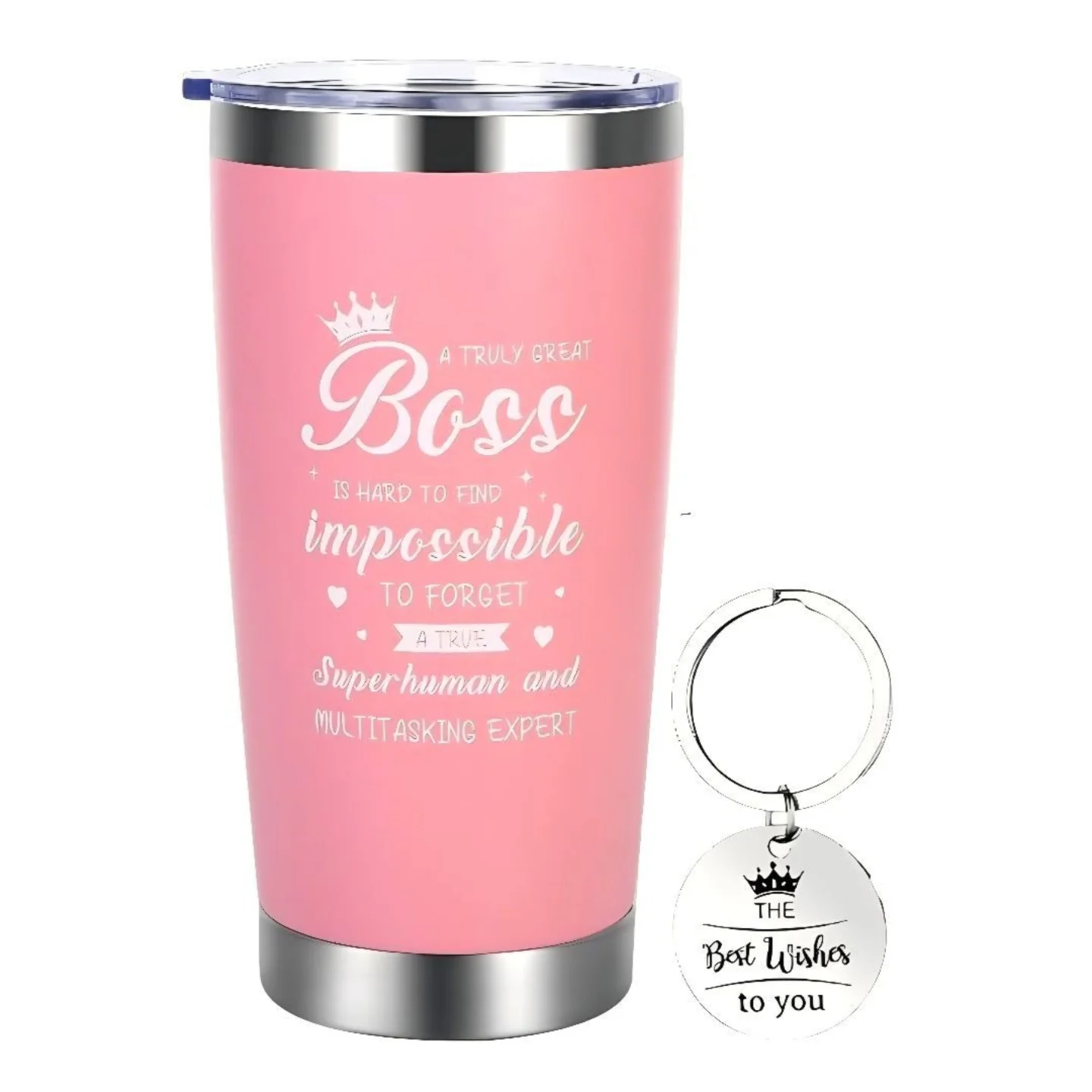 This Heartening Gifts Boss Appreciation Gift Set includes a 20oz double-wall vacuum insulated stainless steel travel tumbler, perfect for keeping beverages hot or cold. It comes with a matching ‘Best Wishes’ stainless steel keychain. The pink tumbler features a heartfelt message for a truly great boss, making it an ideal thank you or appreciation gift.