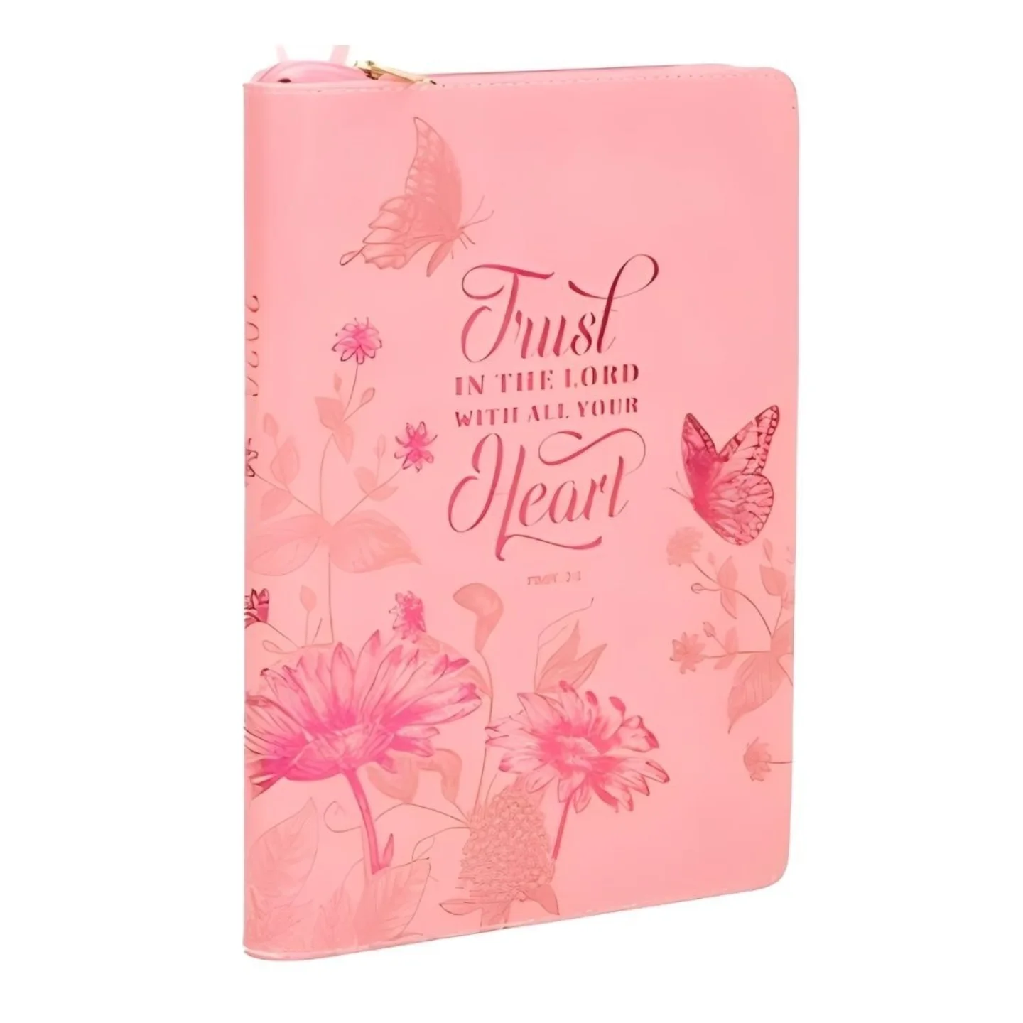 This 2026 12-month executive planner features a pink faux leather cover with a zippered closure, adorned with butterflies and floral designs, and the inspiring text ‘Trust In The Lord With All Your Heart’. It includes 400 pages with daily, monthly, and yearly scheduling options, daily Scripture verses, and a coordinating satin ribbon marker. Measuring 6.5″ x 9″, this planner is designed for organization and spiritual reflection.