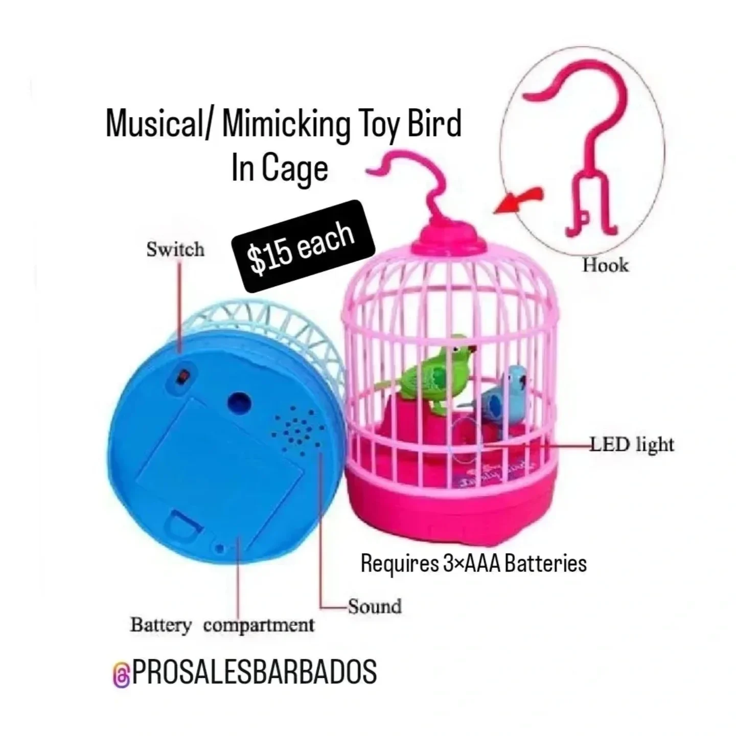 This toy features a musical, mimicking bird inside a cage, complete with a hook for hanging. It requires 3 AAA batteries and includes a switch and LED light for interactive play.