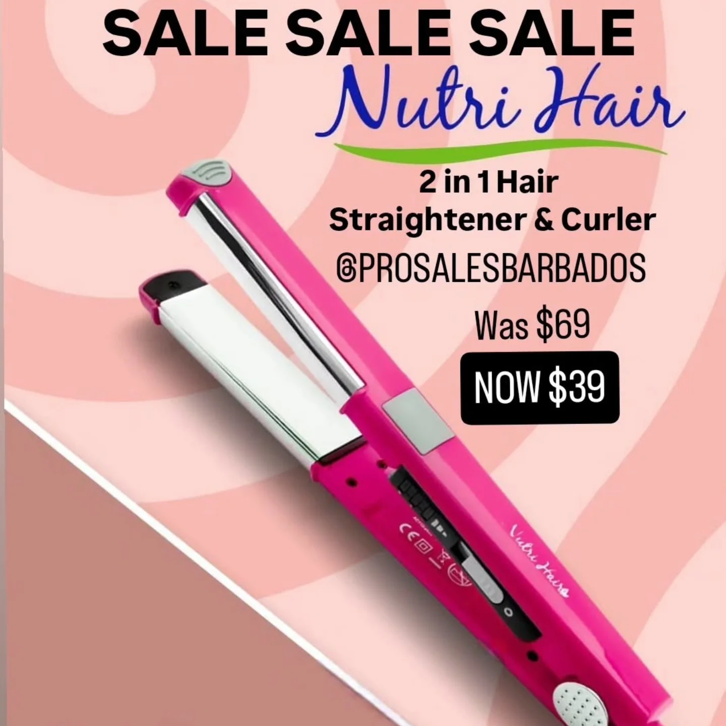 This is a vibrant pink Nutri Hair 2-in-1 hair styling tool, functioning as both a straightener and a curler. It offers versatile styling options for various hair types, perfect for achieving different looks.