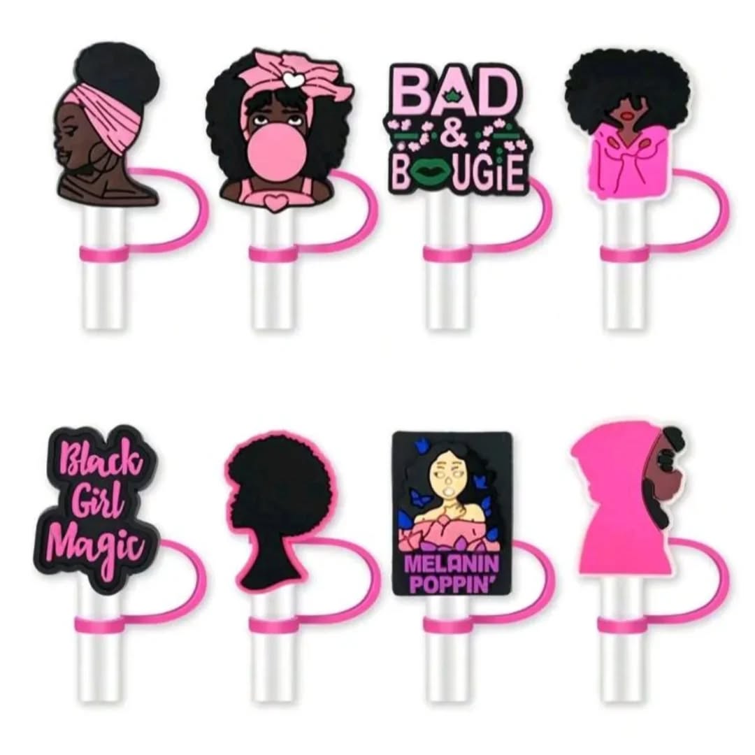 These pink Stanley cup straw covers are compatible with 30oz and 40oz cups. They feature various afrocentric designs in vibrant colors, perfect for personalizing your drinkware.