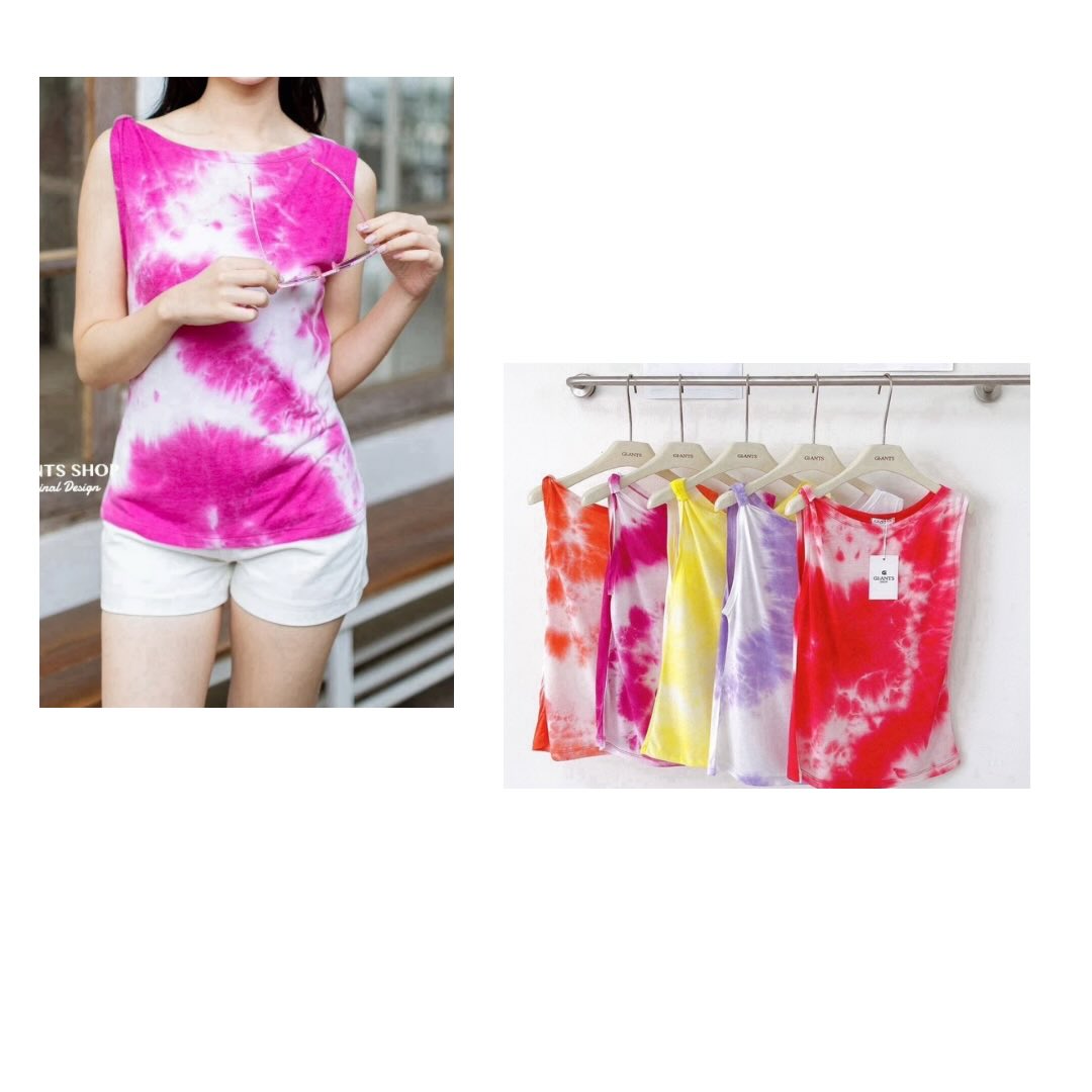 This is a women’s sleeveless tank top with a tie-dye pattern. It features a boat neckline and is made of a soft, breathable material. Available in multiple colors.