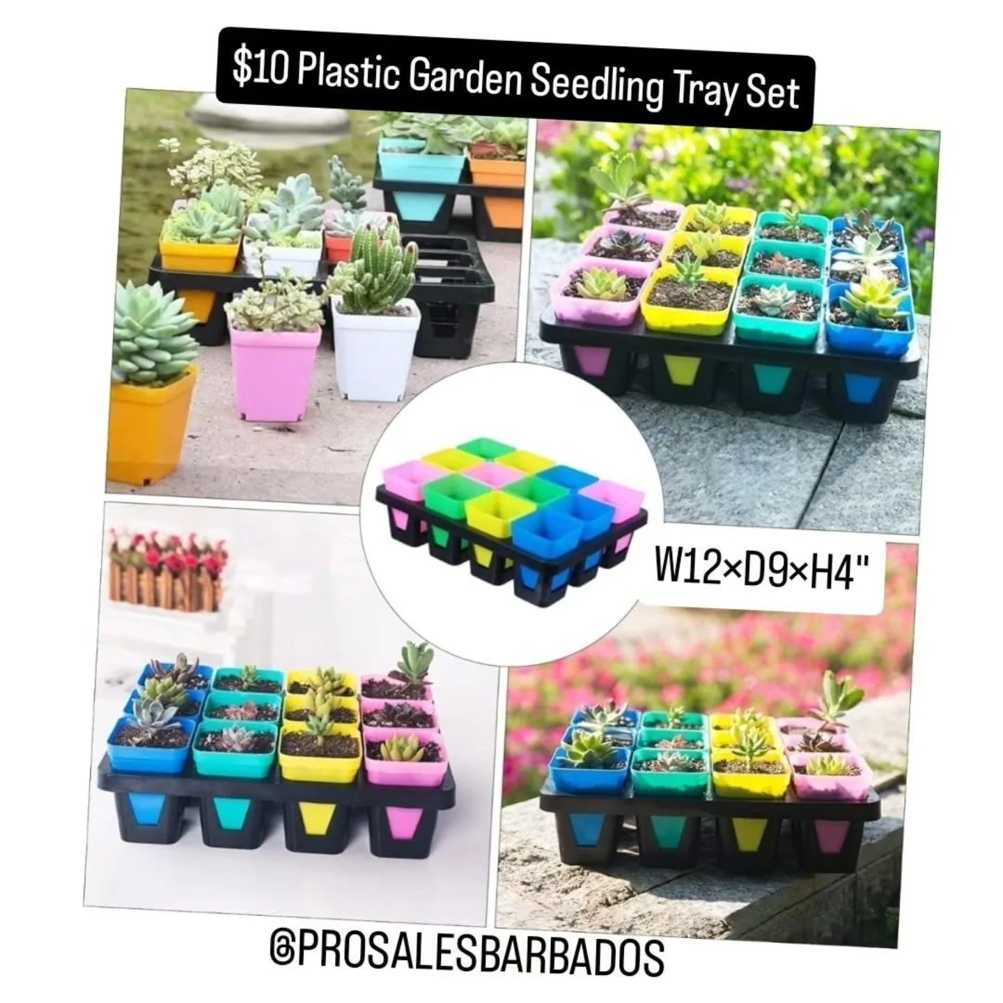 This set includes brightly colored plastic seedling trays, perfect for organizing and displaying small plants. With dimensions of W12xD9xH4 inches, these trays are suitable for garden use. The design features individual compartments to keep seedlings neatly separated.