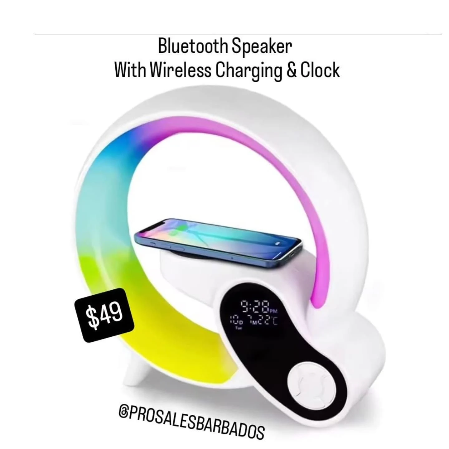 A versatile Bluetooth speaker from Pro Sales, featuring wireless charging capabilities and an integrated digital clock with temperature display. It also includes a colorful ambient light.