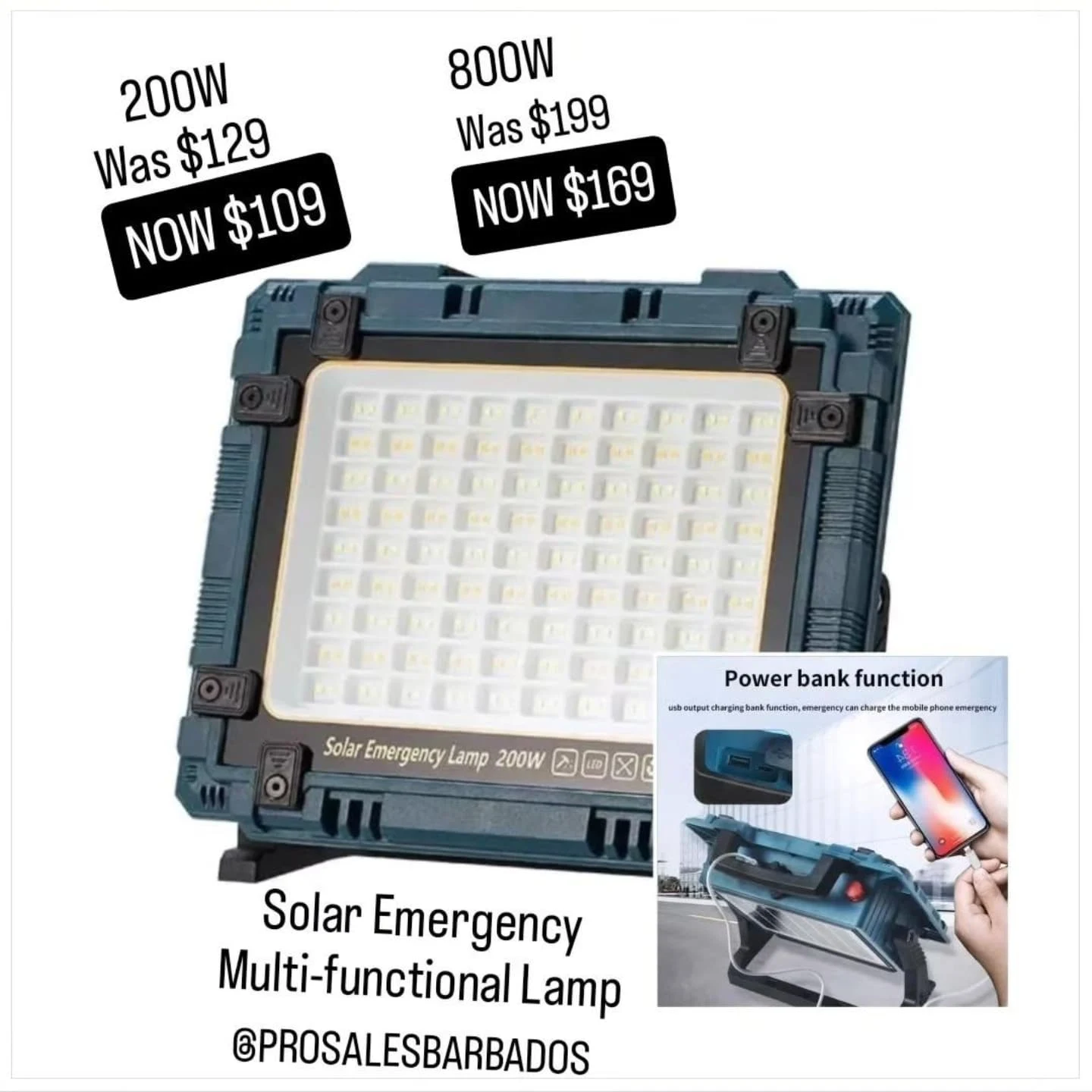 This Pro Sales multi-functional solar emergency lamp provides bright LED illumination and features a built-in power bank function for charging mobile devices via USB. Its rugged design makes it suitable for outdoor use and emergency situations, available in 200W and 800W power variants.