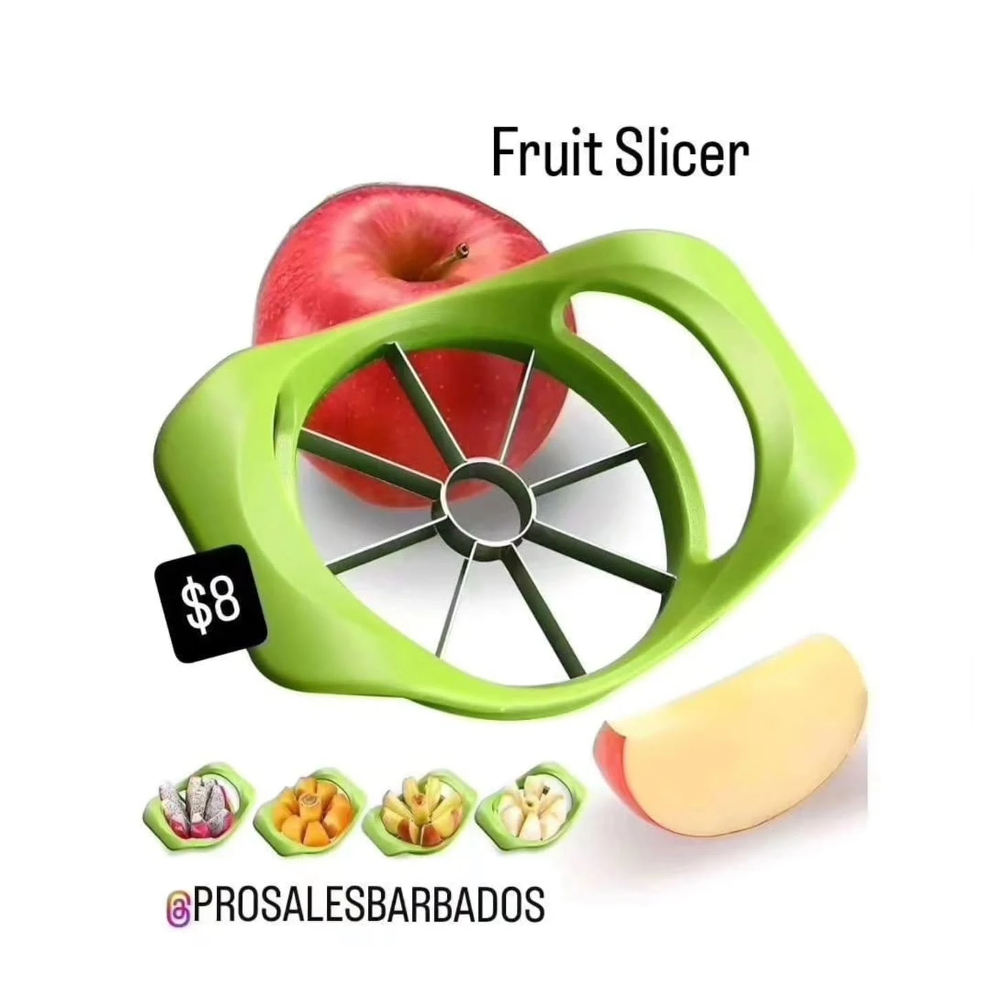 A versatile fruit slicer and corer, featuring a green plastic frame and stainless steel blades, designed for easily slicing various fruits like apples, mangoes, and dragon fruit into uniform pieces. Available from Pro Sales.