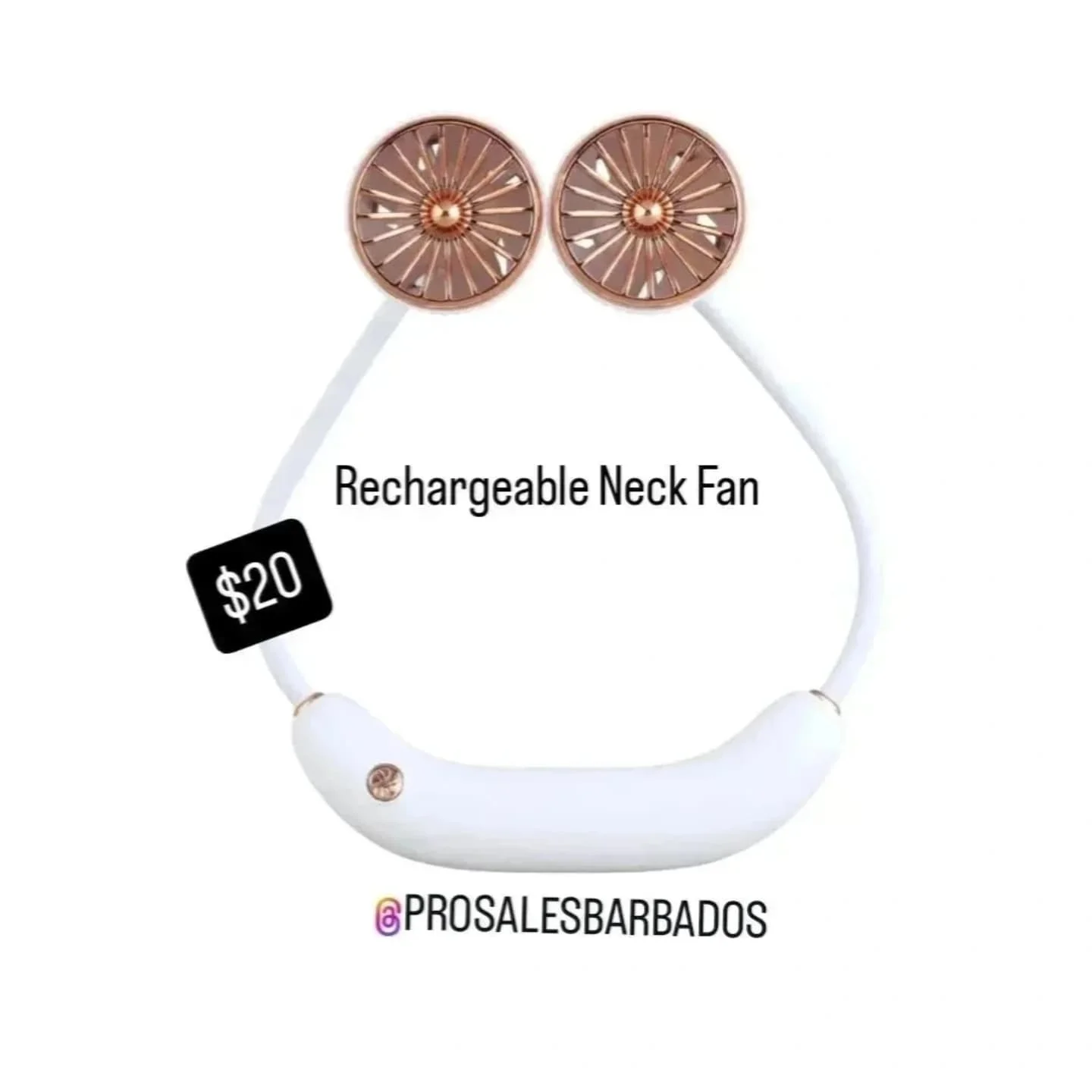 A portable, wearable neck fan designed for personal cooling, featuring a rechargeable battery for convenience.