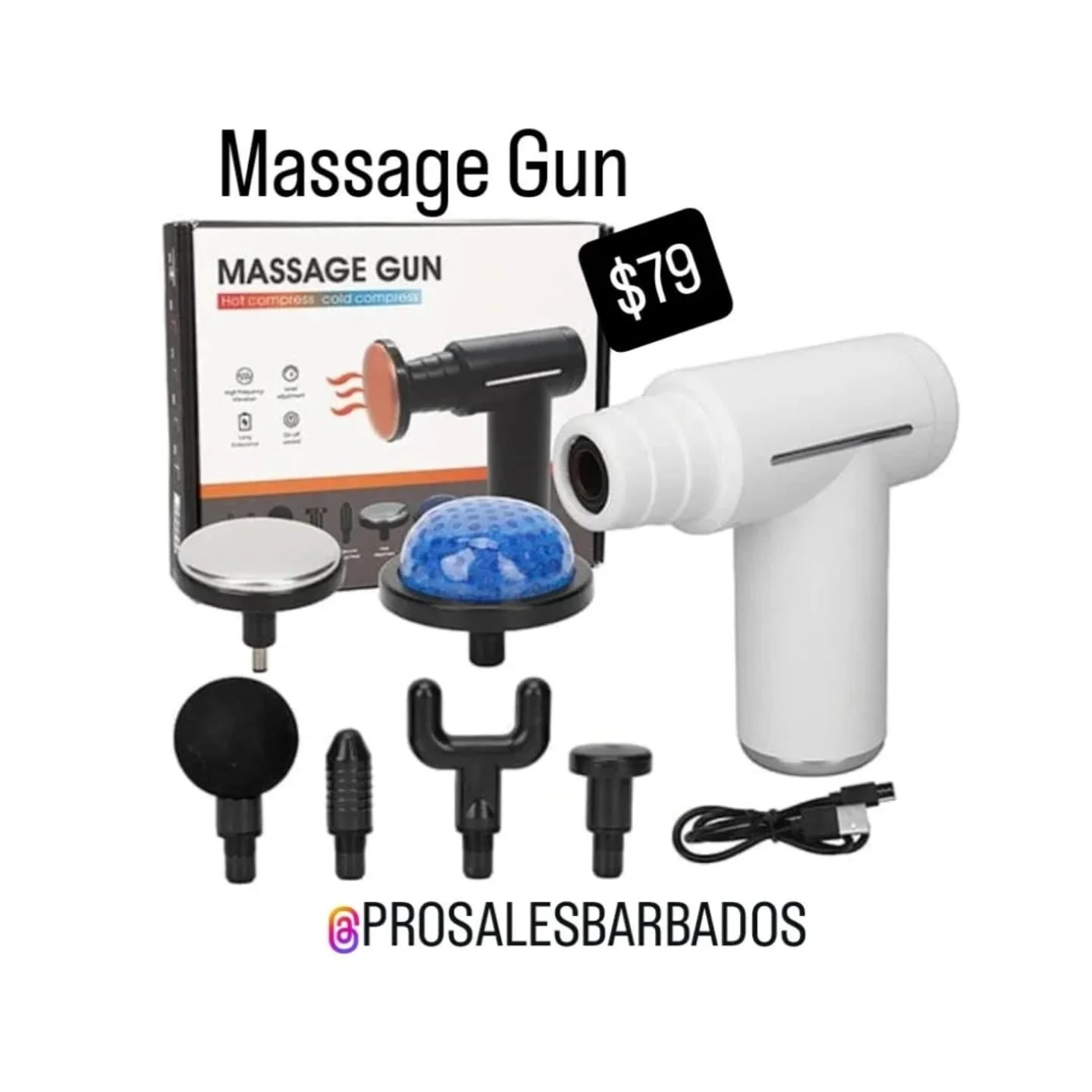 A versatile massage gun featuring both hot and cold compress functions, designed for muscle relief and recovery. Comes with multiple interchangeable massage heads for various applications.