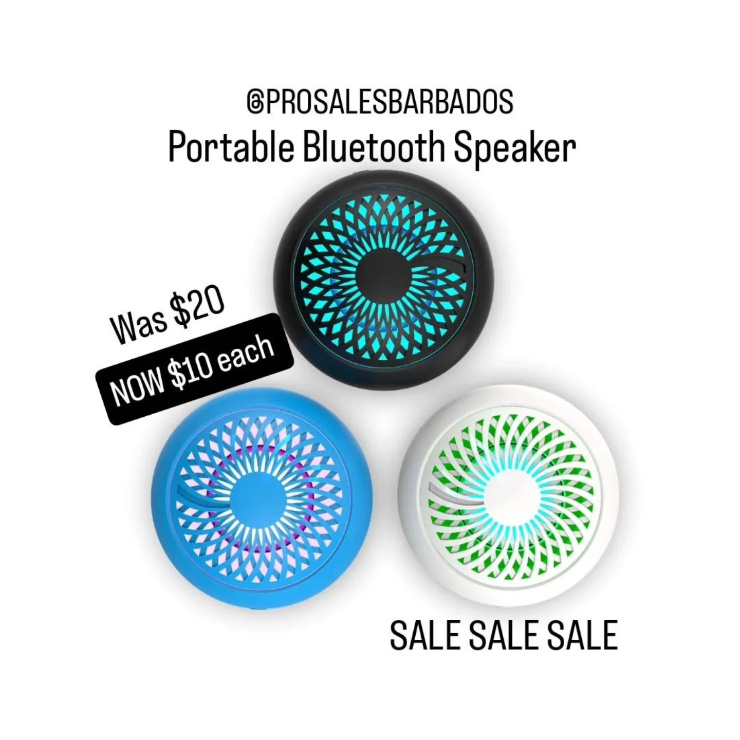 The ProSalesBarbados Portable Bluetooth Speaker is available in three colors: black, blue, and white. It features a vibrant geometric design with cool lighting effects. Compact and versatile, it’s suited for both personal and group listening experiences.
